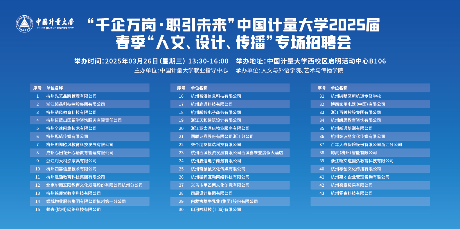 为深入贯彻落实党中央、国务院关于促进高校毕业生就业创业的决策部署,深化校企协同育人,助力2025届毕业生高质量就业,3月26日,中国计量大学“千企万岗 职引未来”2025届毕业生春季“人文、设计、传播”专场招聘会在西区启明活动中心B106成功举办。本次招聘会由人文与外语学院、艺术与传播学院联合主办,吸引了40余家省内外企业参与,提供涵盖文化创意、广告设计、教育培训、外贸、国际交流等领域的岗位,为毕业生搭建了精准对接的就业平台。