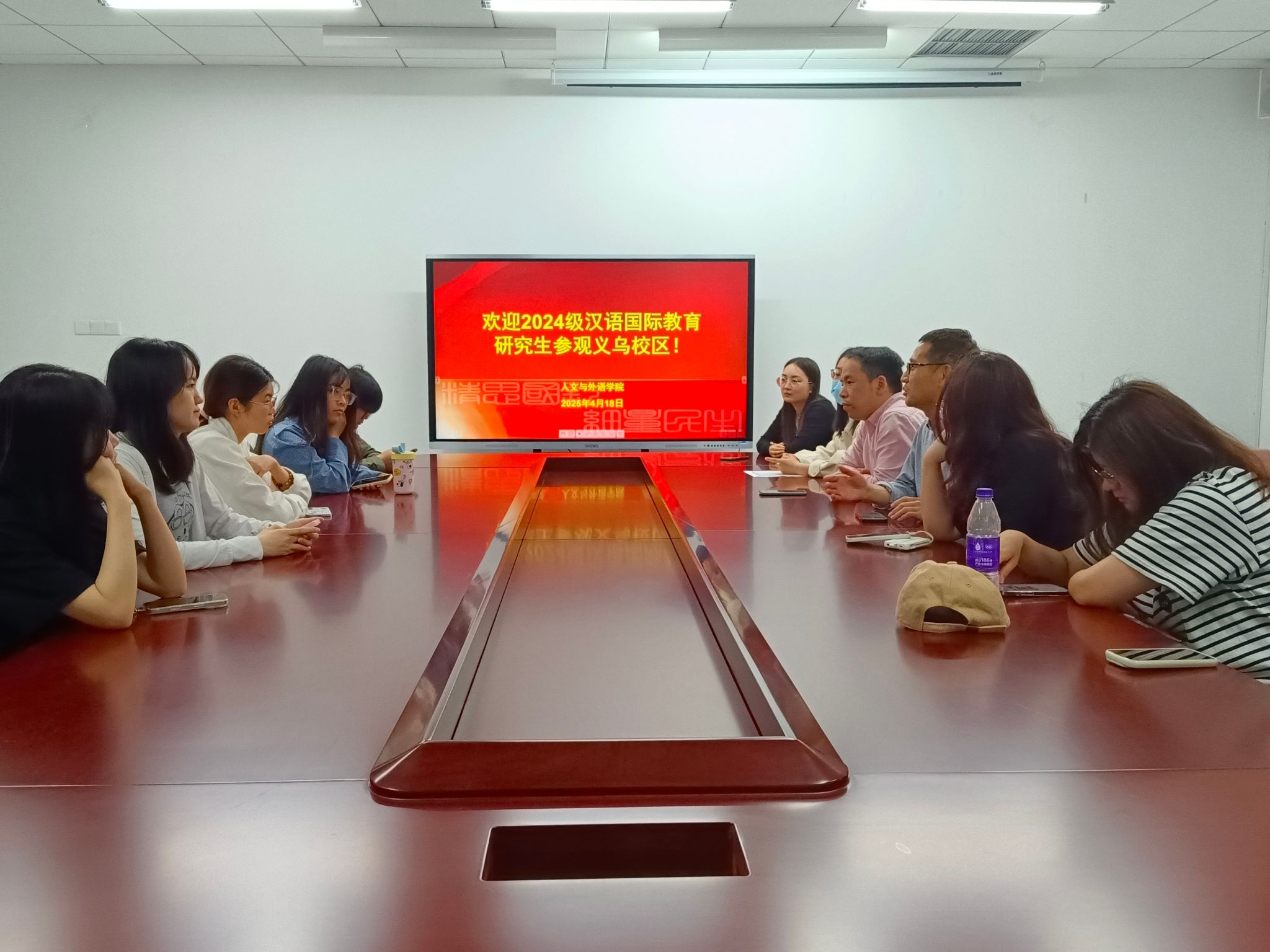 4月18日下午,人文与外语学院党委副书记金民华、副院长朱锋刚、研究生辅导员李豪敏率2024级汉语国际教育专业研究生一行,从杭州校区乘坐校车抵达义乌校区,开展了一场以“以心暖心·共话成长”为主题的交流学习活动。此次活动通过座谈交流、实地考察等形式,搭建起新老生沟通桥梁,为2024级研究生顺利过渡校区生活奠定基础。