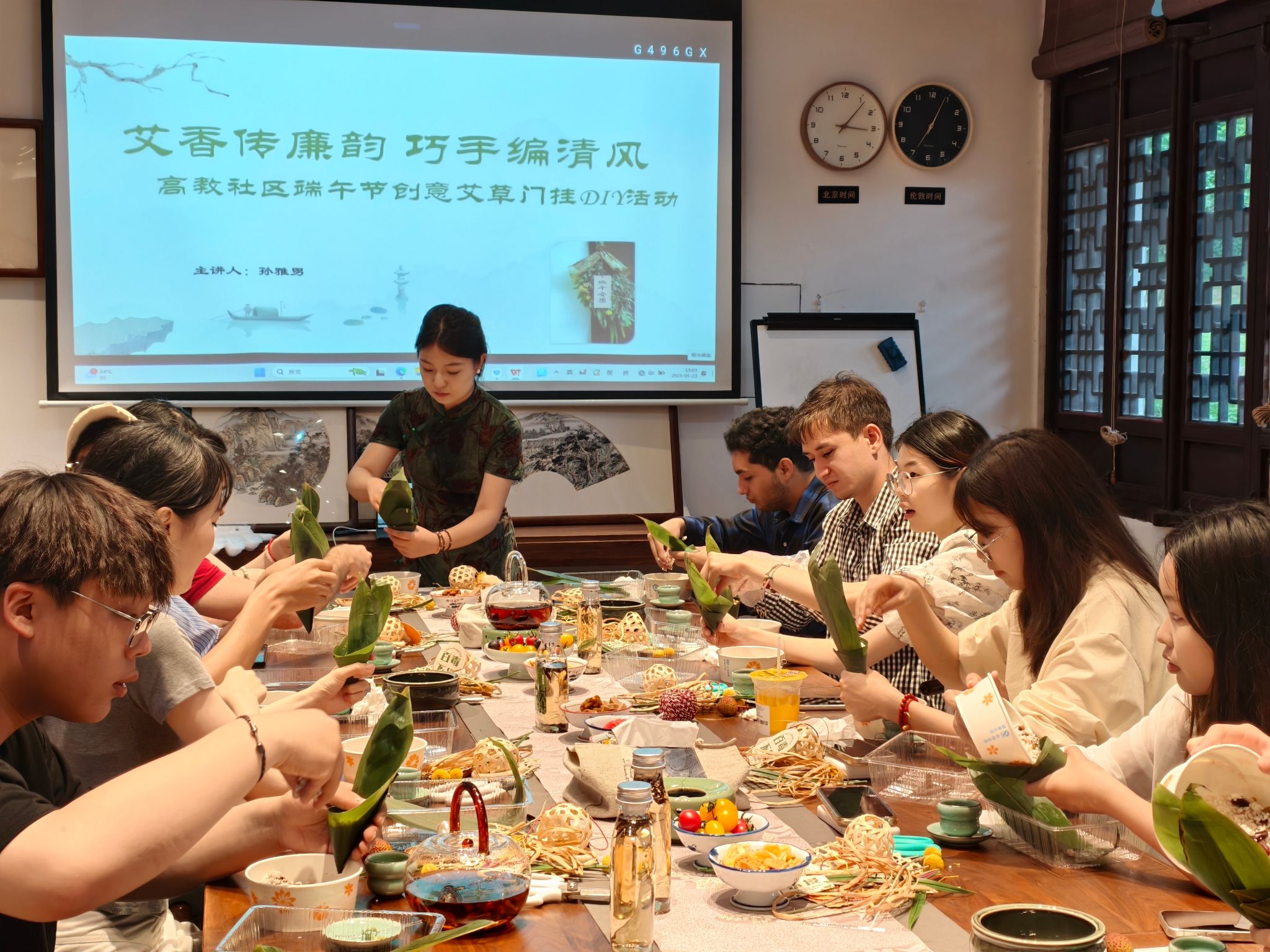 在艾草门挂制作环节,孙雅男逐一讲解菖蒲驱邪纳福、艾草驱蚊安神的功效,以及五彩流苏吉祥安康的寓意。在制作过程中,她耐心协助每位学生调整造型,确保每个人都能顺利完成。通过亲手制作艾草门挂,留学生们不仅学会了这一传统技艺,更深刻理解了艾草、菖蒲的药用价值以及端午节悬挂艾草门挂的民俗寓意,对中国传统文化的认识愈发深入。