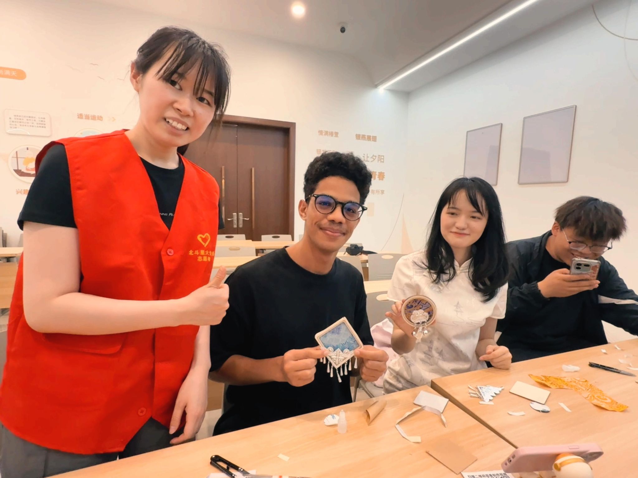 活动当天,大北社区活动室内气氛热烈而融洽。社区精心筹备此次活动,旨在让居民近距离接触非遗文化,感受传统手工艺的独特魅力。中国计量大学的中国学生主动承担起引领责任,带领留学生一同深入了解社区文化与中国非遗。