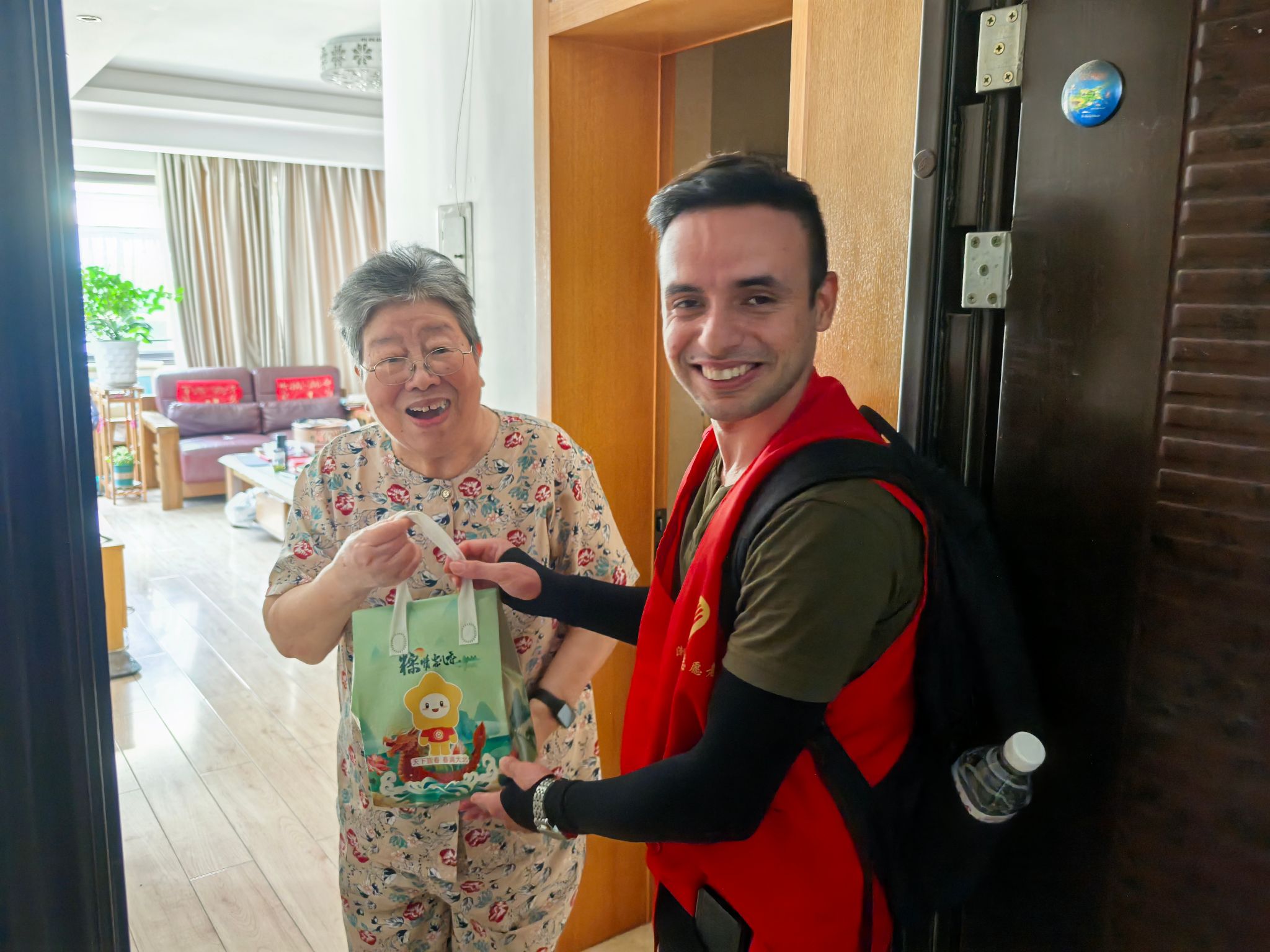 随后,师生们和留学生分成多个小组,带着煮好的粽子,走进独居老人的家中。每到一户,大家都亲切地与老人拉家常,询问他们的身体状况和生活需求,为他们送上节日的祝福。老人们接过粽子,脸上洋溢着幸福的笑容,对同学们和留学生的到来表示由衷的感谢。