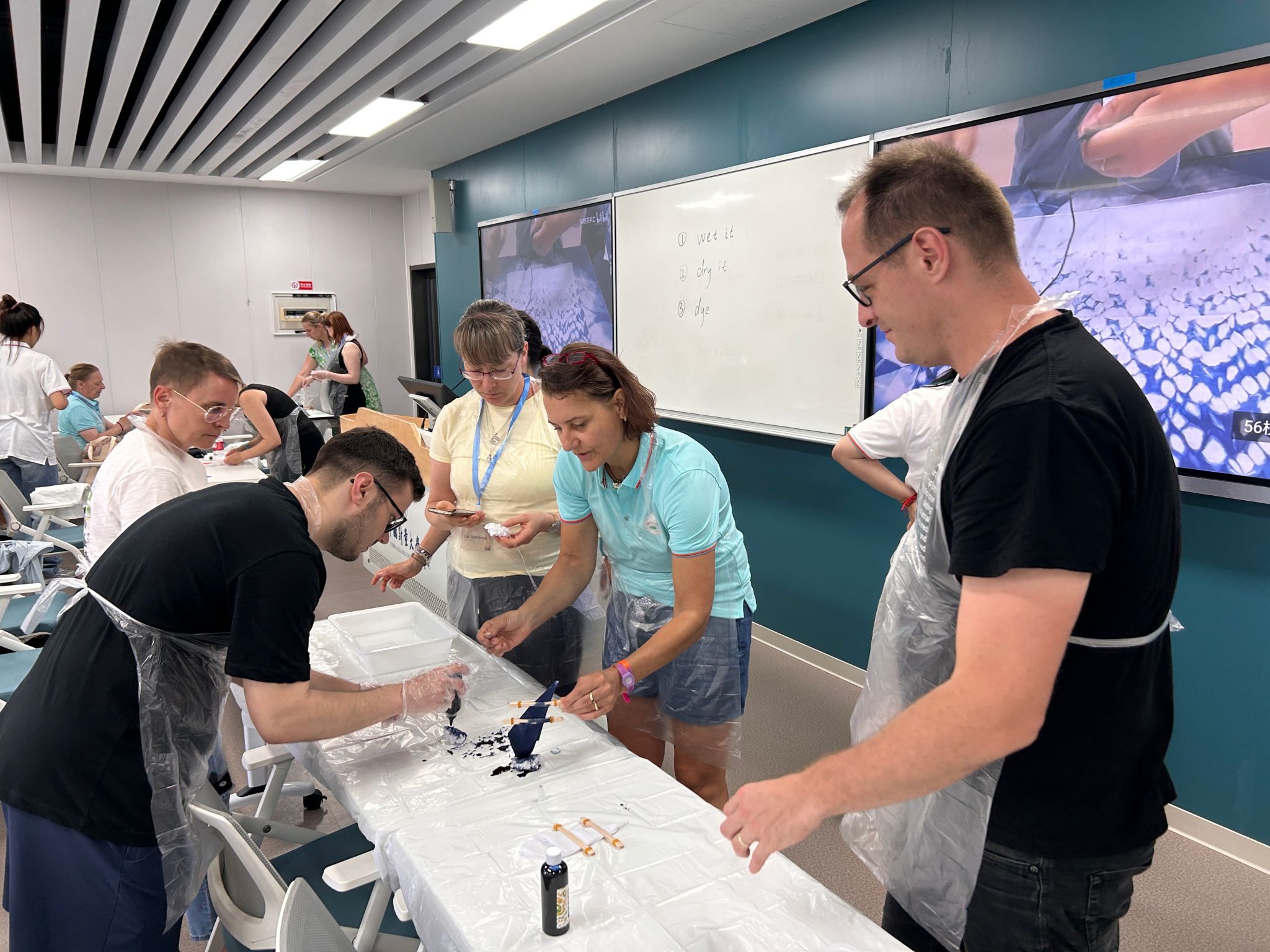 郭白芮在发言中对中国计量大学团队的精心组织表示感谢,希望本届夏令营和第一届一样,提高学员的汉语水平,加深学员对中国的了解,留下美好的回忆。简洁的开班仪式之后,全体与会人员合影留念并前往计量博物馆参观。下午,非遗扎染非遗手工活动让学员们沉浸其中。当晚,学员们分组到6位教师家里参加中国家庭参访教学活动,品尝地道的中国家常菜,沉浸式体验中国人的日常生活。这批学员于6月29日乘机抵达萧山国际场,30日游览了西湖。