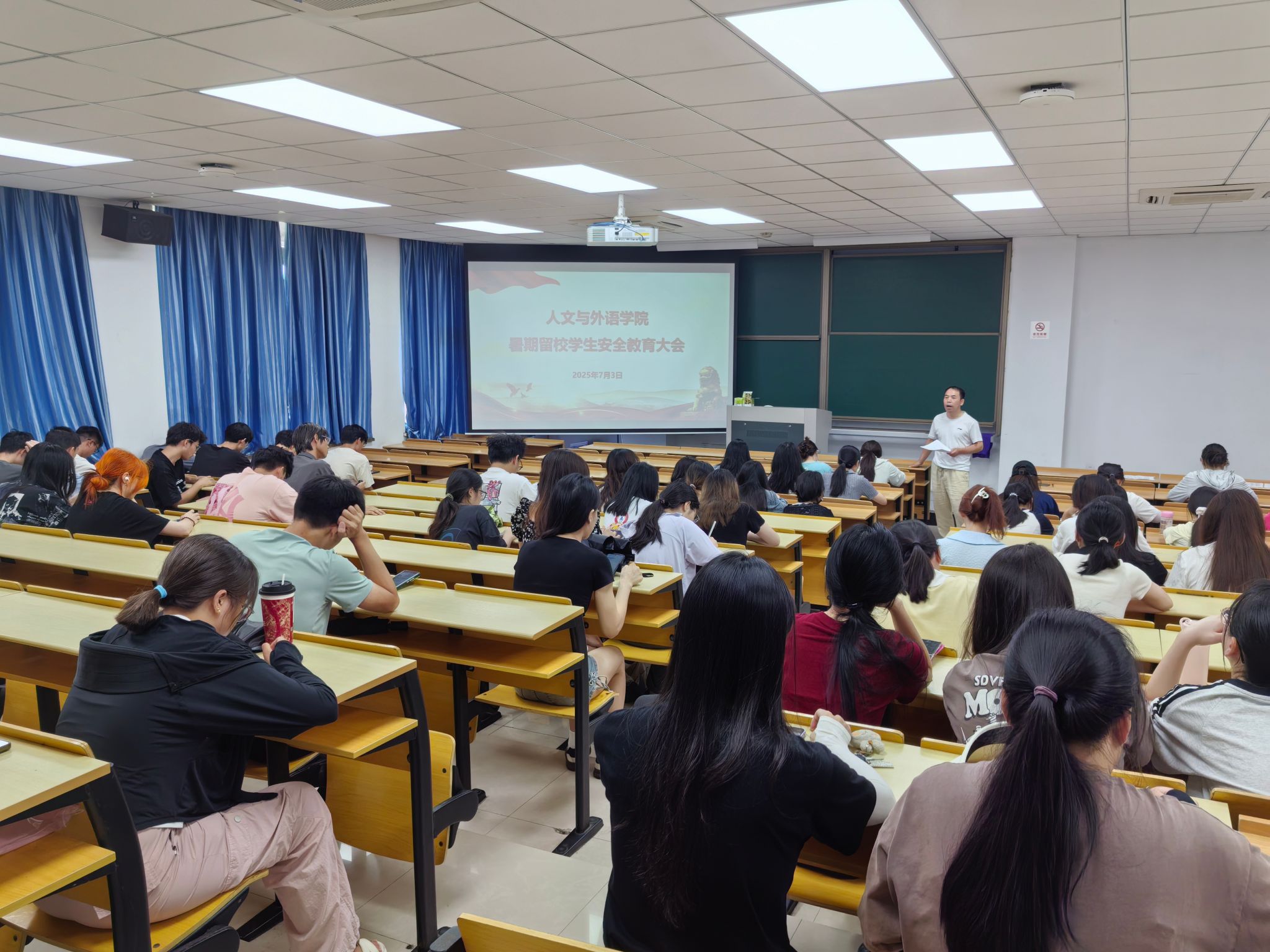 为切实保障暑期留校学生的安全与健康,强化学生的安全意识与自我管理能力,7 月 3 日,人文与外语学院于翔宇 301 教室召开了暑期留校学生安全教育大会。学院党委副书记金民华、全体辅导员以及暑假留校学生共同参加了此次会议。