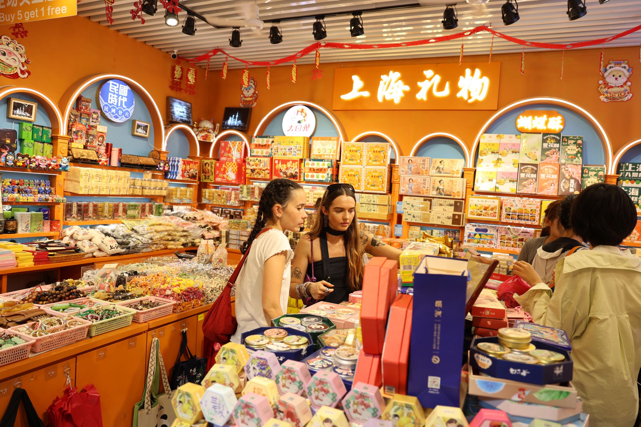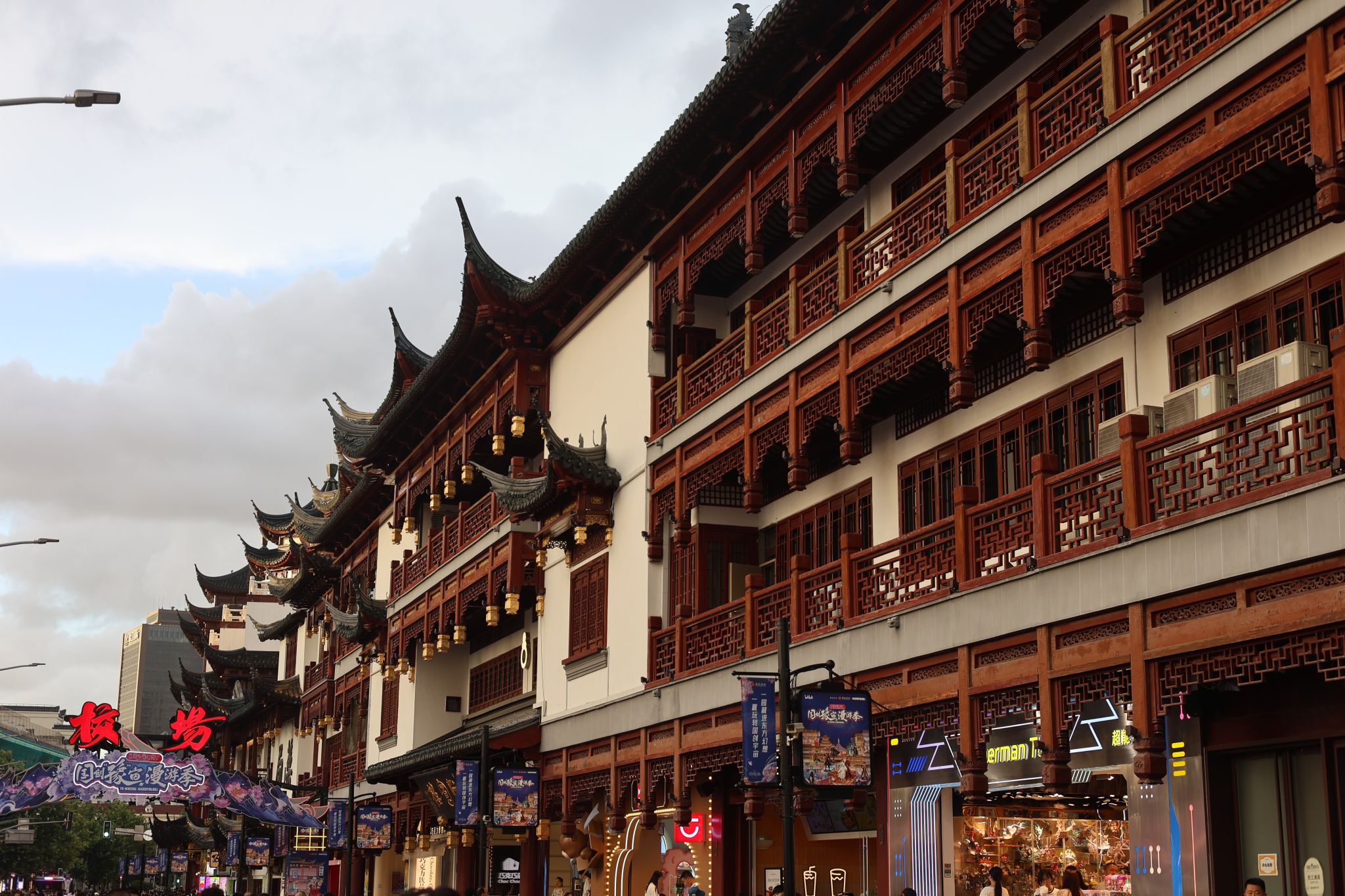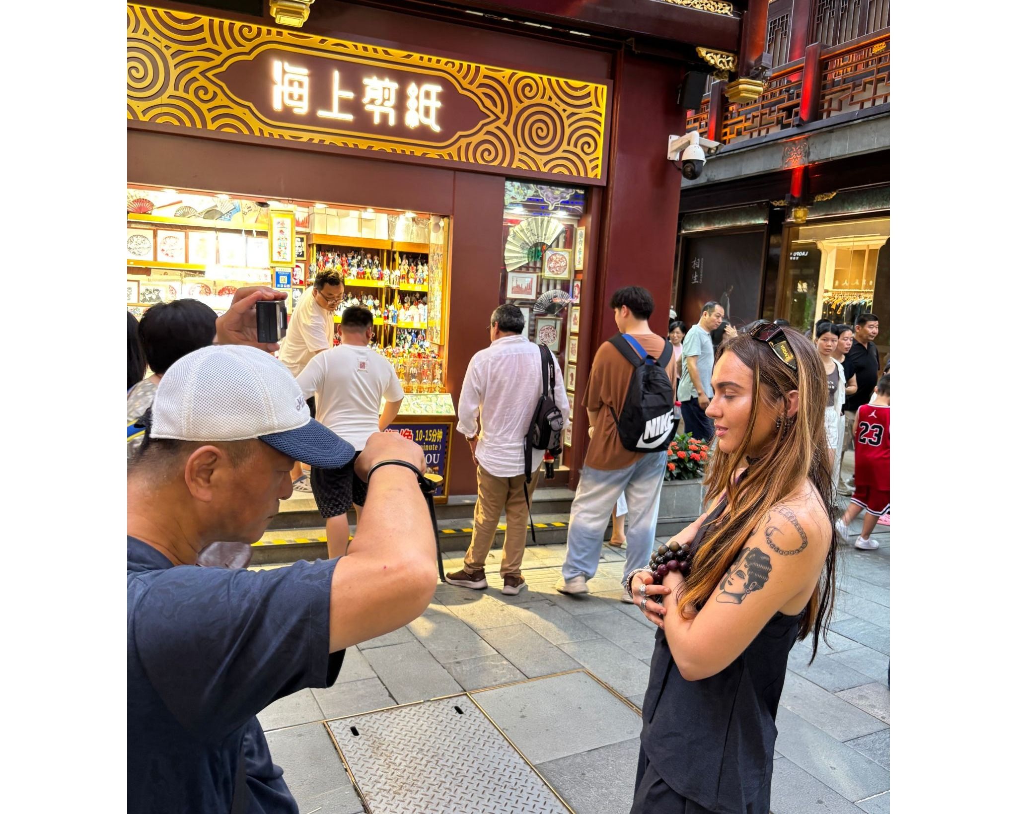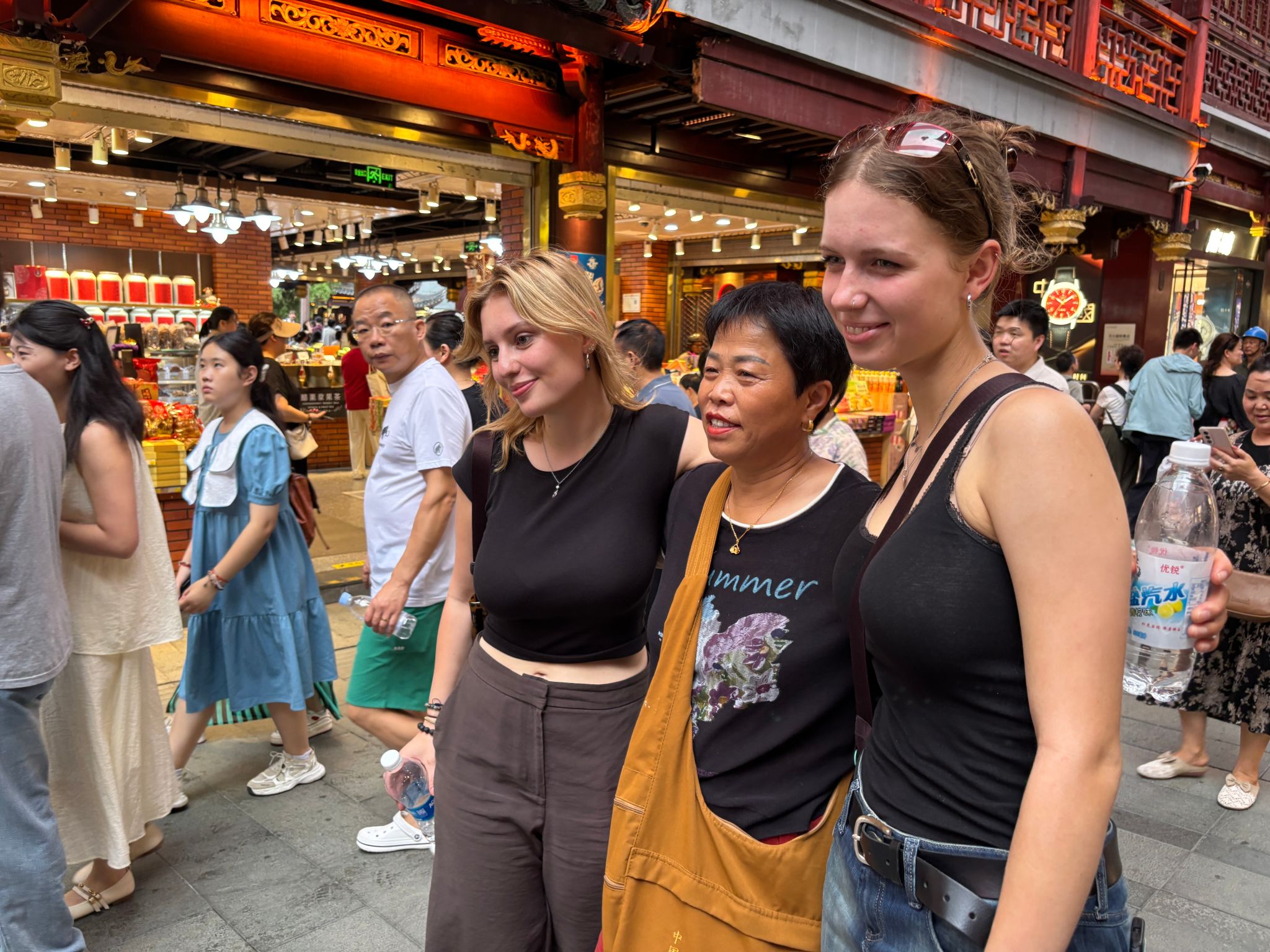 下午四点,学员们步行抵达豫园老街和城隍庙街区,这里时空流动感更为奇妙。如果要体验明清江南建筑基底与当代中国市民文化的活态传承,要感受老城厢的日常生活与二次元破壁共舞的艺术魅力,要寻找上海传统文化和流行元素交融共进的打卡地标,这里可能是不二之选。飞檐斗拱下品茶听曲,市井商铺里触摸剪纸泥塑,在香火鼎盛的庙宇与烟火缭绕的食肆中,活色生香的中国文化以穿越历史的形态展现在眼前。火红晚霞映衬着远处摩天楼的天际线,升腾的烟火和川流不息的游客填满了九曲桥的石阶,想找一块独属于自己的风景实在很难,拍一张只有自己身影的照片更难。生活就是如此,我们是他人生活的背景,学员们也成了他人镜头里的风景。敏夏被摄影师邀请留影,泰林与伙伴则被热情的中国阿姨拉入同框。