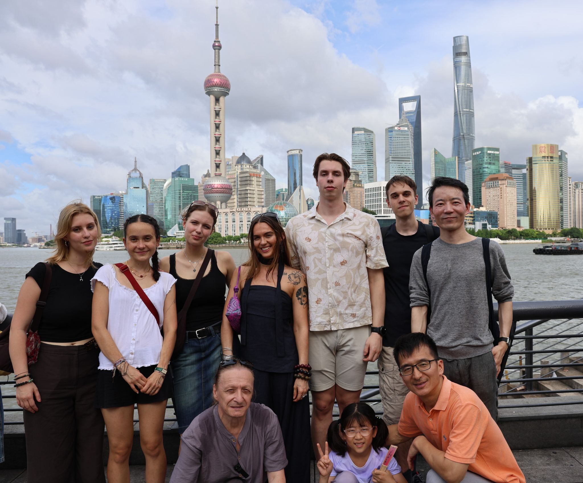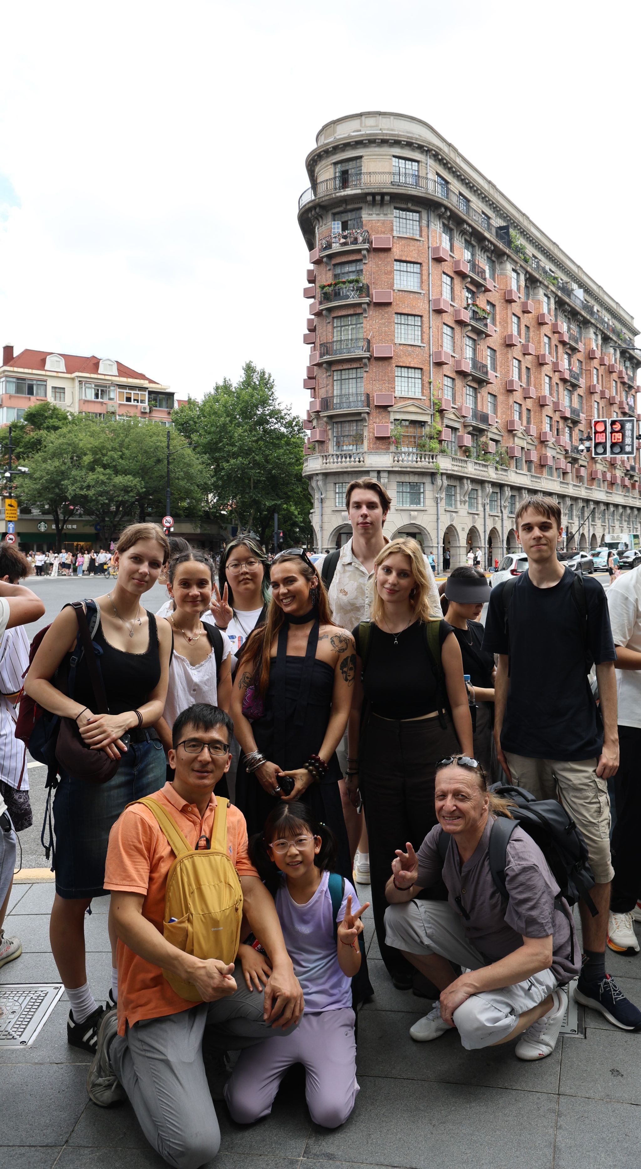 2025年7月19日是周六,对于中国计量大学第二届语言文化夏令营4周项目的学员们来说,结束了一周密集而又充实的语言课、文化讲座和非遗体验活动,期待已久的上海城市文化体验之旅开始了。早上七点半,火红太阳已经无法掩饰炎炎夏日的威严,夏令营的7名学员已经从方圆楼汇入文泽路地铁站的人流,在一股清凉中与等候在此的蒋进国老师一道,开启上海文化参访之旅。李丰源博士和刘懿瑶助教在杭州东站与大家一起登上高铁,50分钟后,一行人已经走出上海南站熙攘的出站大厅。同站换乘地铁1号线,9分钟后,衡山路站出口的阳光就映入眼帘。淮海中路人行道上人流穿梭不息,茂密的梧桐树下凉风习习,密集的蝉声此起彼伏。转角处,武康大楼独特的船形三角轮廓赫然进入视野。这座融合法兰西文艺复兴风格与中式骑楼智慧的建筑,成为学员们理解海派文化“海纳百川”特征的生动起点:开放包容、中西合璧、务实创新、多元融合。夏令营魔都之行的流动的风景线,就从这里一路延伸。