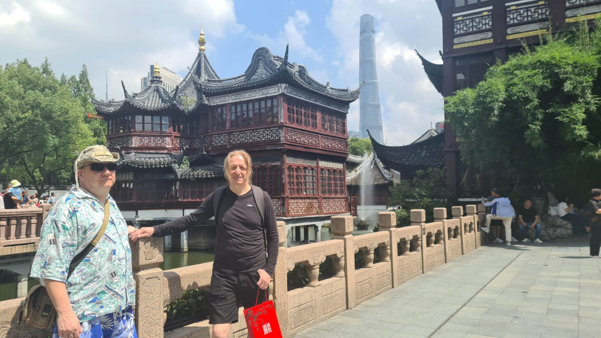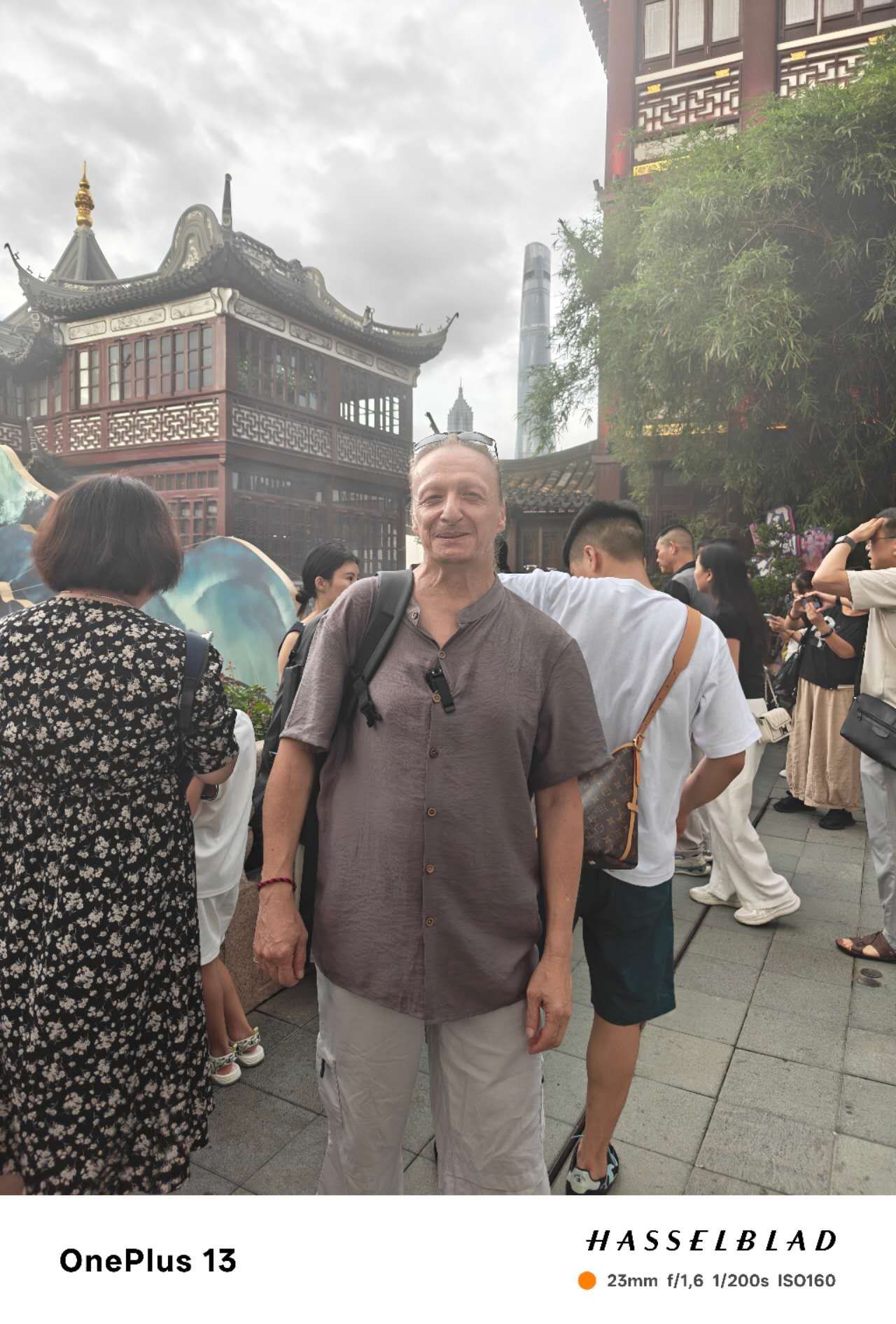 59岁的严科(Jan Kočvara)是本届夏令营里最年长者。他在九曲桥前翻出手机里2023年10月与哥哥在此地的合影,请蒋老师在相同位置为他再拍一张。“捷克共和国有时差,过一会我会把照片发给他。”两年前那张合影里,他和哥哥靠在九曲桥的石栏前,游人比今天少多了。严科和哥哥都喜欢旅行,上次他的哥哥提议来中国,他们住在上海的holiday inn酒店15天,几乎走遍了上海的大街小巷。故地重游,他感慨说,只有两年的时间,上海和杭州街头新能源汽车更多了,而在捷克新能源汽车比燃油车昂贵许多。他所住的城市里有1.6万居民,电动汽车只有十几辆,目前只有三个公共充电站。老照片与新影像,传统飞檐与现代楼宇,在九曲桥畔交汇,流动的时光在此刻有了具象的刻度。