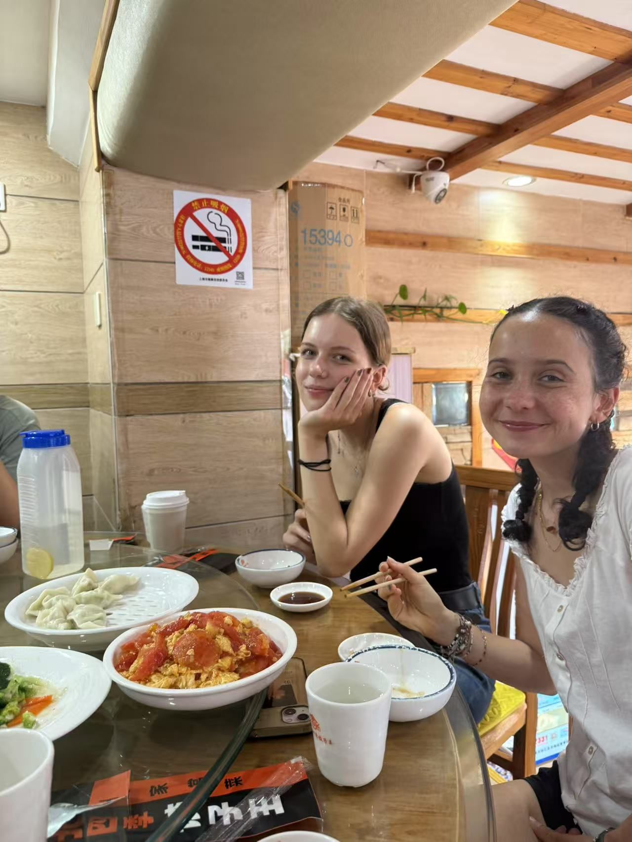 穿行于武康路周边的街巷,午餐的选择权交到了学员手中。领队李丰源推荐了街角的Baker&Spice,他熟悉这里烤得焦香的三明治和新鲜食材。住在意大利的捷克女孩敏夏(Michela Belotti)眼睛一亮:这里可能有她抵华后尚未寻获的那杯理想的咖啡。一杯醇香入喉,果然不错,她向李丰源竖起大拇指。而在几步之遥,泰林(Adela Srchova)、林溪(Linda Hajkova)和阿加塔(Agáta Lorencová)三位初到中国的捷克女孩,却对刚才路过的那家饺子馆念念不忘。她们决定折返回去,点上一大盘素馅饺子。刚出锅的饺子白白胖胖、热气腾腾,配上地道的番茄炒鸡蛋和清炒西蓝花,要说能抚慰淮海中路烈日下行走之后的辘辘饥肠,可能找不到比这更好的待客之道了。女孩们品尝美味的幸福感写在脸上,是对自己选择多走一个街区的最好肯定。同一片街区,咖啡的醇厚与饺子的鲜香交织,流动的风景线里,是不同文化背景下的个体,在烟火日常中寻找属于自己的舒适与惊喜。