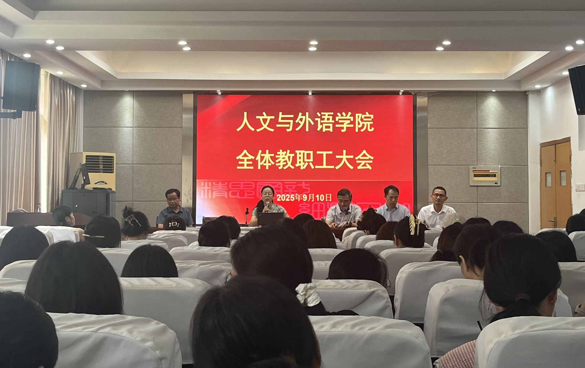 9月10日,人文与外语学院在格中307召开新学期全体教职工大会,全面部署新学年的各项工作,并举行教师节庆祝仪式。会议由学院党委书记赵蓓茁主持,学院党政领导班子及全体教职工出席会议。