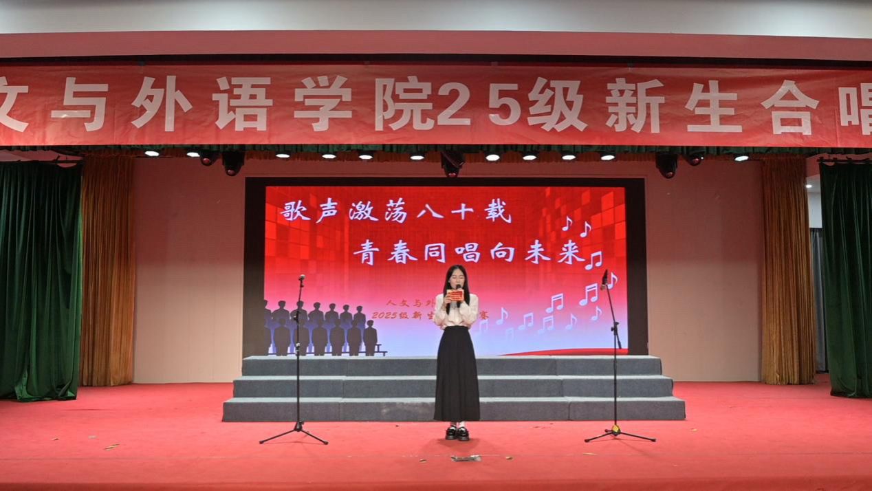 为纪念中国人民抗日战争暨世界反法西斯战争胜利80周年,弘扬爱国主义精神,厚植爱国主义情怀,9月24日晚,人文与外语学院“歌声激荡八十载,青春同唱向未来”2025级新生合唱比赛在启明活动中心举行顺利。本次比赛邀请学院团委副书记张璇老师,校均钟合唱团成员黄文羽、景含璐、吴雨阳,学院学生会主席团成员孟弋琳、王鸣飞、柯雅雯担任评委。