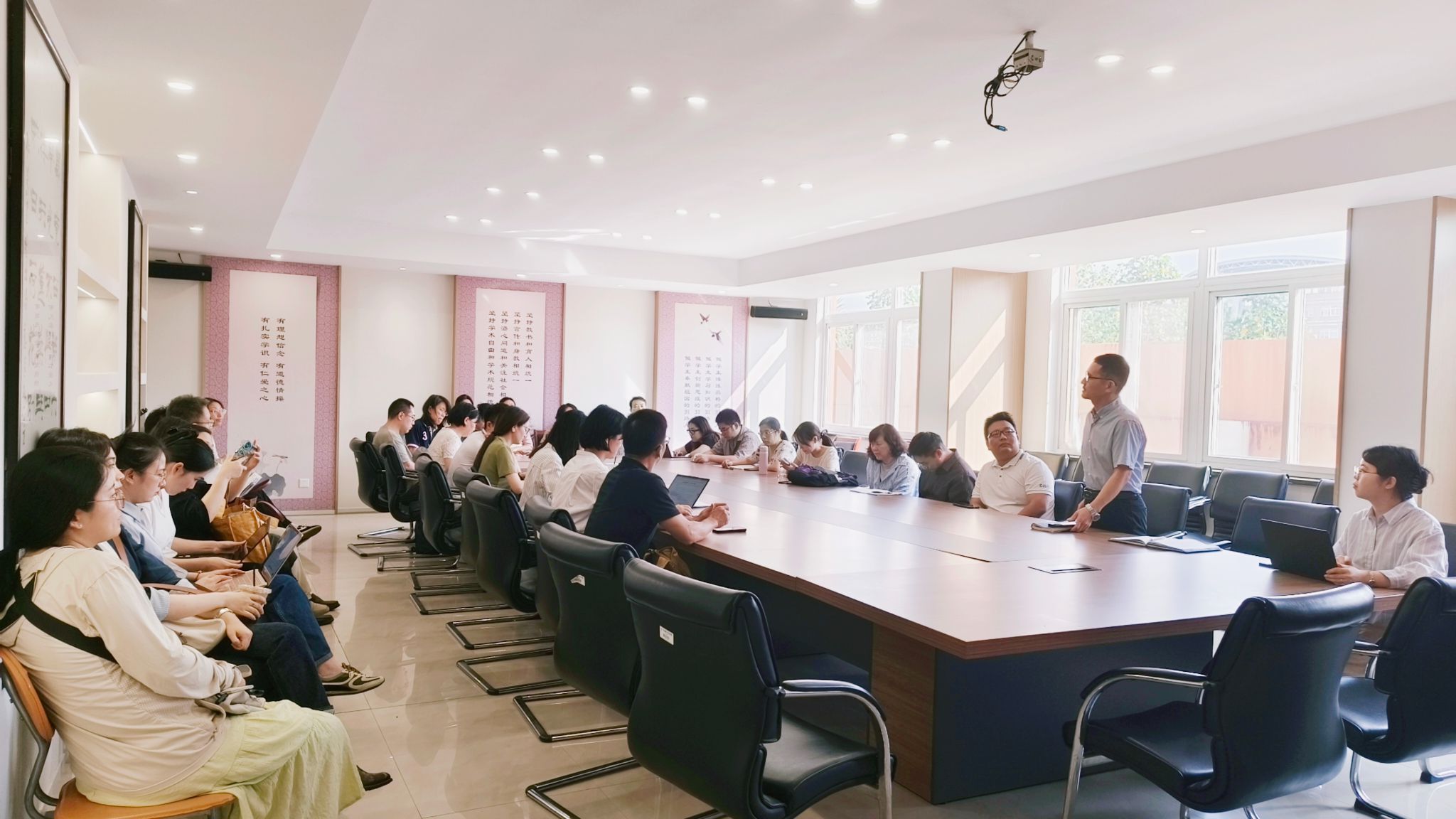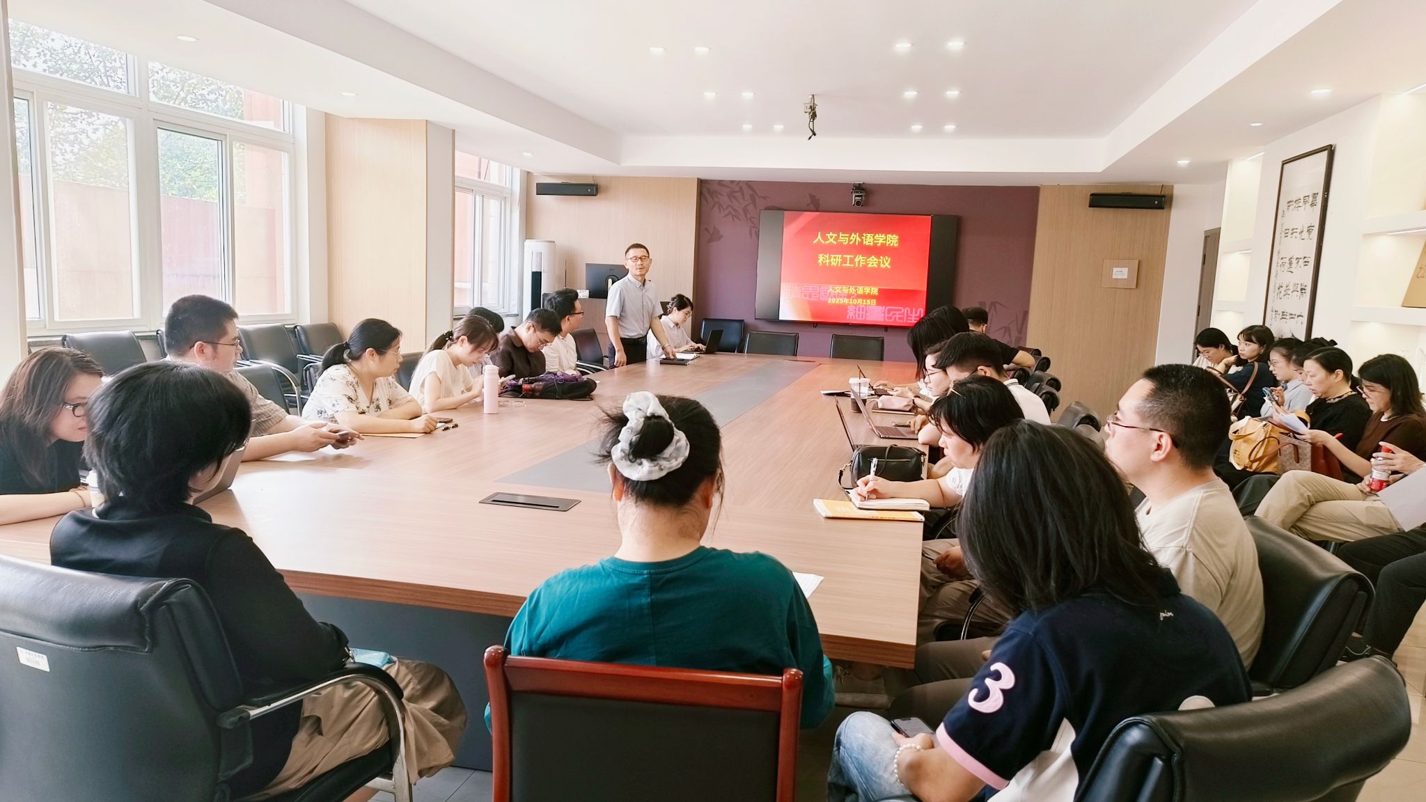 10月15日,人文外语学院在格致南楼222会议室开展科研工作会,学院各专业、系部负责人;具有高级、副高级职称教师;中青年教师代表等参会,会议由朱锋刚主持。