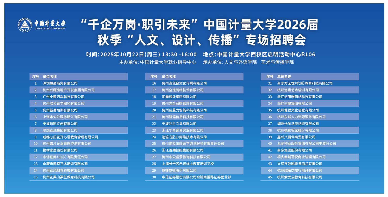 为深入贯彻落实教育部关于做好2026届全国普通高校毕业生就业创业工作的决策部署,抢抓秋季校园招聘黄金期,加强校企联动与人才共育,促进毕业生更高质量充分就业,10月22日,中国计量大学2026届毕业生秋季“人文、设计、传播”专场招聘会在西区启明活动中心B106成功举办。