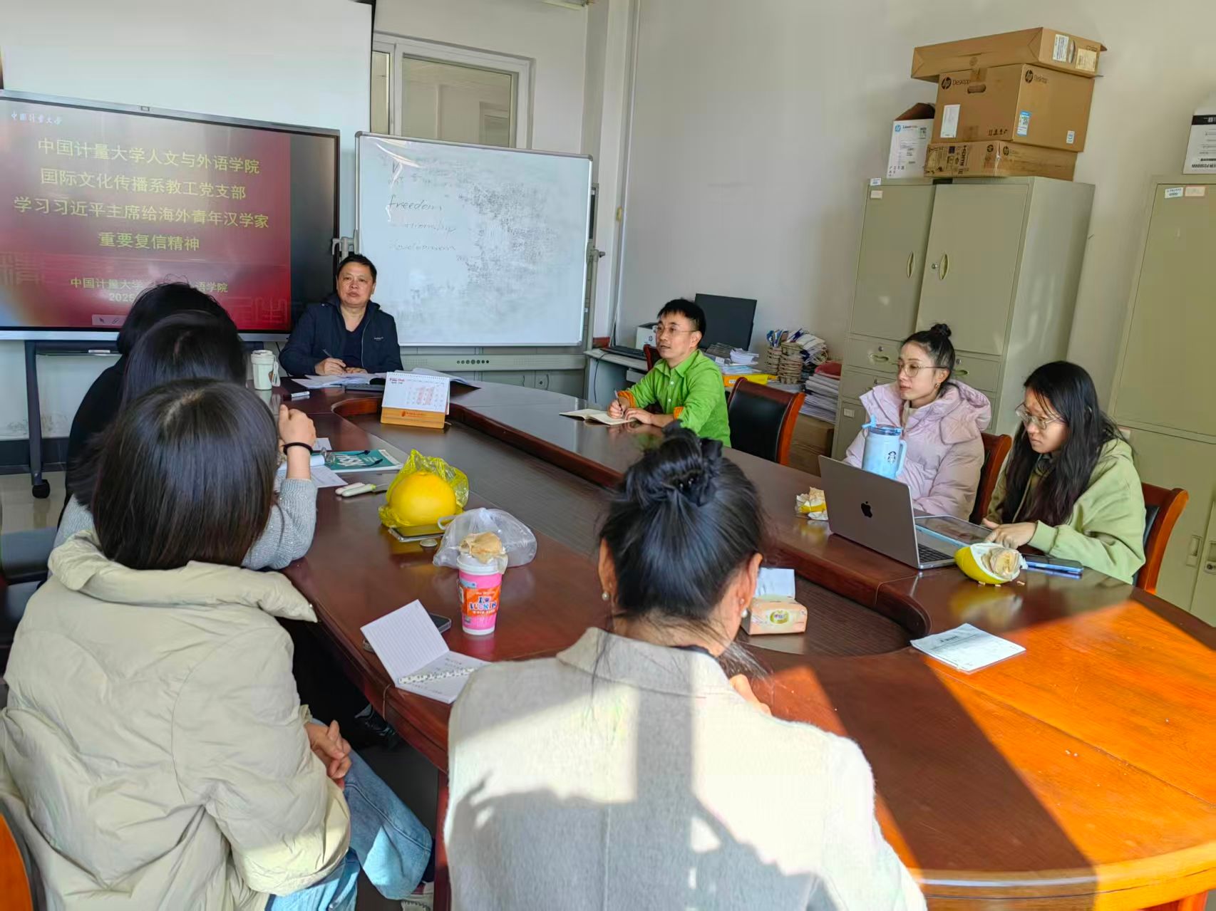 11月19日下午,人外学院国际文化传播系教工党支部学习座谈会在格中324举行,支部全体党员及教师参会。会议由支部书记王华勇主持,他宣读了复信内容,介绍了系部教师参与2025世界中文大会的基本情况,传达了教育部关于加强国际中文教育与汉学研究的指导精神,并鼓励全系师生进一步提高政治站位、拓宽国际视野、深化研究能力,致力于培养更多优秀的青年汉学人才。习近平主席的复信不仅是对青年汉学家的勉励,也是对从事国际中文教育、中国学研究和中外人文交流工作的教育者的重要指引。复信强调青年汉学家要当好融通中外文明的使者,“向世界介绍真实、立体、全面的中国,为推动构建人类命运共同体贡献智慧和力量”,这也对系部团队的学术方向、人才培养和国际传播工作提出了更高要求。