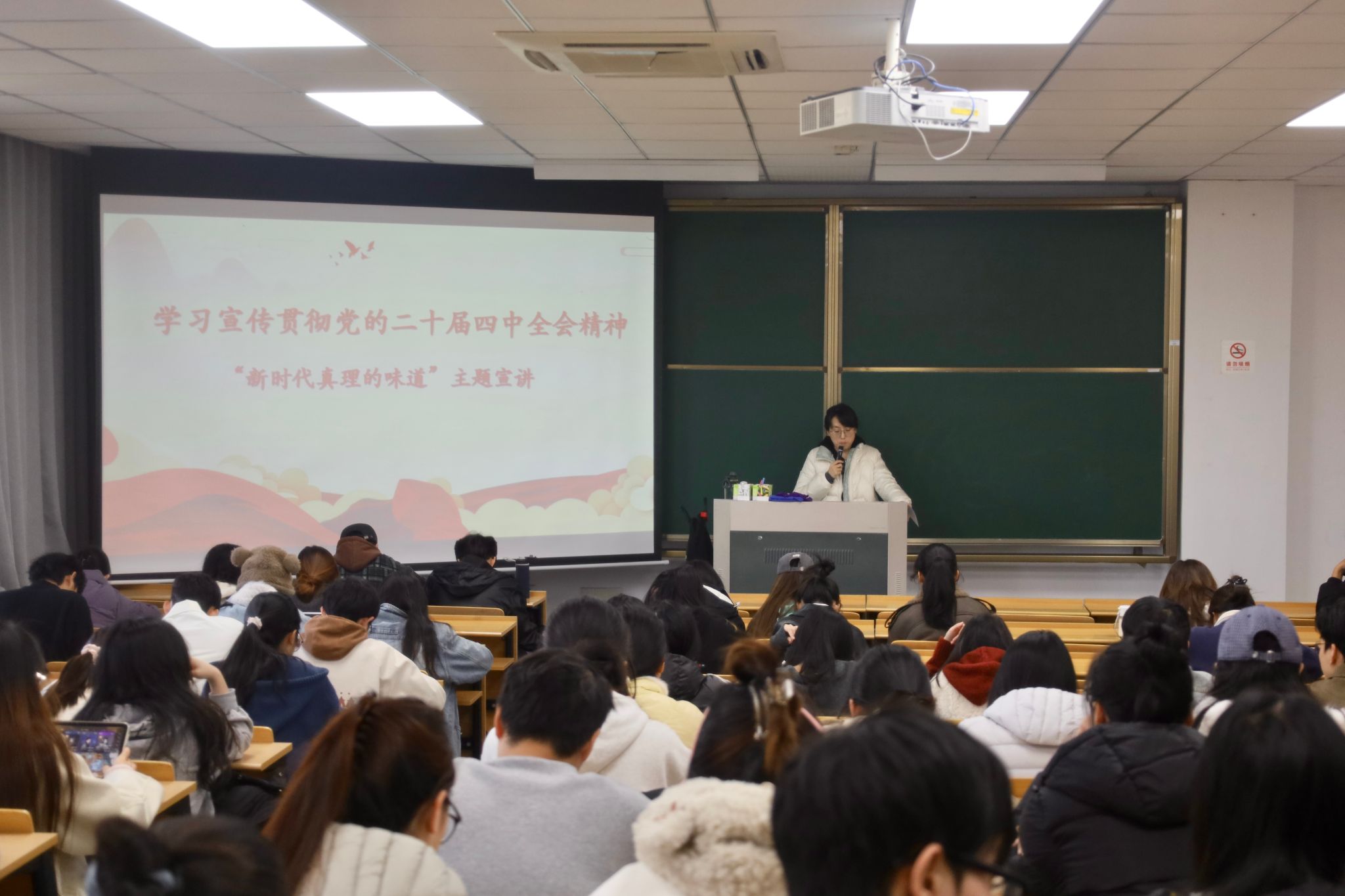 为深入学习贯彻党的二十届四中全会精神,切实推动学习宣传贯彻工作走深走实,11月21日中午,人文与外语学院党委在翔宇楼303教室组织开展“新时代真理的味道”主题宣讲会。本次宣讲由人文与外语学院学工办主任、辅导员赵敏主讲,学院兼职组织员董剡筠、学生党员、入党积极分子及学生骨干代表共计180余人参加学习。