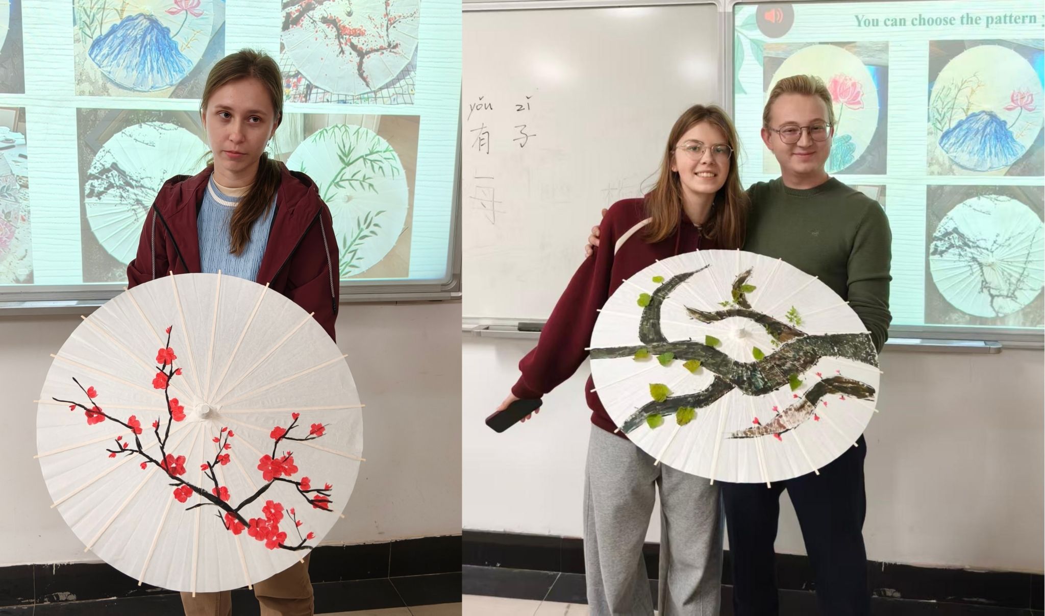随后的手绘环节成为了想象力与文化交流的狂欢,来自俄罗斯的毅刚与25级汉硕研究生合作,在伞面上描绘了绚烂的樱花与一位立于烈日下的侠客。他兴奋地分享道:“樱花是转瞬即逝的美丽,而侠客是我想象中最具‘中国风’的英雄形象,我想把这两种美结合在一起。”