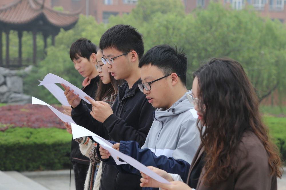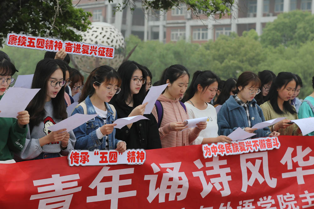 在主持的简短开场白后,诵诗活动正式开始。大家每个人都精神抖擞、昂扬向上,手握“让五四精神烛照复兴征程”、“牢记五四历史”、“民族复兴不懈奋斗”等红色爱国箴言。担任本次活动的领读者是公管和公关专业学生党支部的朱航、邱姝雯,汉教和翻译专业学生党支部的陈卓寅,汉语言文学专业学生党支部的王芷晴。
