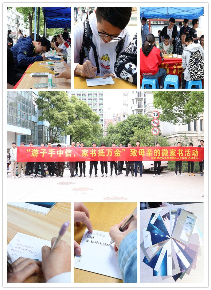 五月的第二个星期天是母亲节,是我们心中最难以忘却的日子。这个节日,是对母亲的赞美和颂扬,是提醒我们时刻记住:感恩我们的母亲。为了鼓励同学们学会向母亲表达爱,说出心里话,机电工程学院心理健康权益中心联合光学与电子科技学院心理健康部、人文与外语学院心理健康部于5月8日中午在G3食堂前举办“游子手中信,家书抵万金”致母亲的微家书活动。