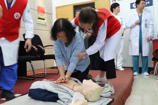 本次活动主要分为三部分。首先,医护工作者逐一分享了自己的内心独白,他们诉说着一直坚持在护理一线的初心,特别是护士长介绍自己的工作年限已有30余年,这让在场师生纷纷鼓掌,表示钦佩。他们诉说着工作中的点点滴滴,让大家对医院文化、护理文化有了进一步的认知和了解;接下来是关于医患关系的问题探讨,主持人列举了潍坊纱布门以及聊城药审案等社会热点问题,带领大家对医疗纠纷进行了热烈的讨论,了解护患、医患之间的共识与隔阂,互相增添了理解与期望;最后,现场进行了急救演练教学,陈霞老师向大家讲解了关于CPR(心肺复苏)的相关理论知识,胸外按压的动作要领,人工呼吸的技巧,AED的使用。姜智文老师进行各环节的操作演示,包括发现病患到确保环境安全、呼救、胸外按压、开放气道、人工呼吸、评估呼吸循环等,老师和同学们在医护人员的指导下,进行了急救实践操作。