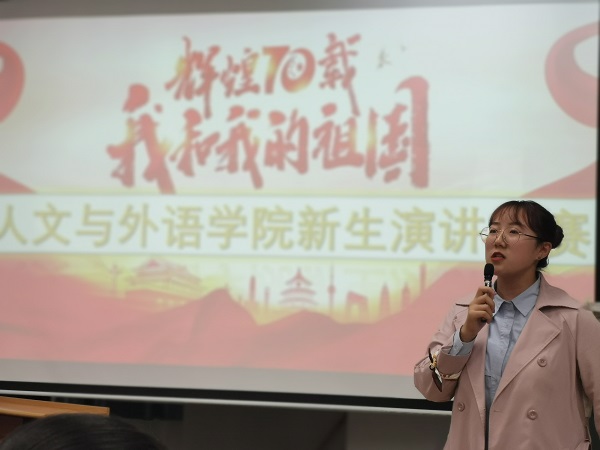 此次演讲比赛参赛选手分别来自人文与外语学院2019级汉语言文学专业、英语专业、汉语国际教育专业、公共管理专业等,他们带着大学新生的青涩与朝气,用或深情或激昂的语言歌颂祖国。他们有的侃侃而谈,讲述自己及家人与祖国的故事,从个体入手以小见大,见证新中国70年的飞速发展;有的直抒胸臆,用优美流畅的文字和抑扬顿挫的语调,抒发对祖国的热爱之情;有的夹叙夹议,提出现实问题和个人思考,激发听众反思•••••他们自然流露的作为中华儿女的自豪感与爱国情,感染了现场,引发阵阵掌声。