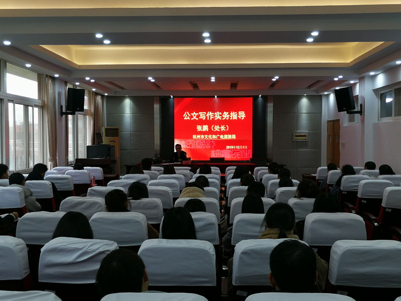 2019年12月1日上午9:00,人文与外语学院在格致中楼307举办了“公文写作实务指导”主题讲座,邀请了杭州市文旅局张鹏处长作为主讲人,旨在通过对公文写作的介绍,让学生了解公文写作的相关规范,启发写作思维,提高实践操作能力,强化公共事业管理专业意识。讲座由人文与外语学院党委书记苏俊杰主持,相关教师和学生参加。