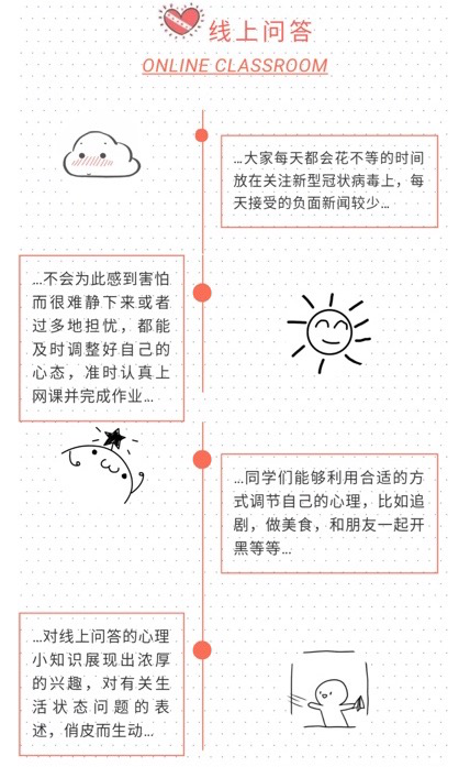 来势汹汹的新型冠状病毒让人措手不及。为更好了解学院学生在疫情期间的心理状况及对线上教学的适应程度,人文与外语学院以心理委员会为抓手,以班级为单位,于2020年2月——3月期间组织开展“互联网+关怀”线上心理活动,帮助同学们解决特殊时期的心理困惑。