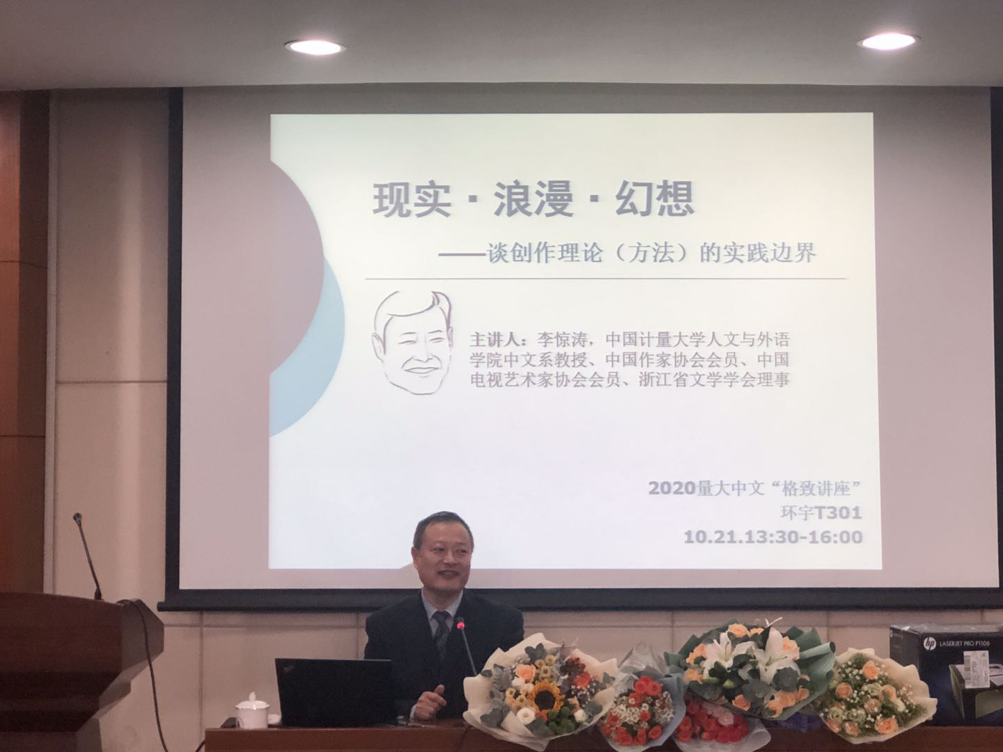 之后,李惊涛教授上台发言,他首先表达了对中文系师生的感谢以及对后继者们的鼓励和祝福。“我认为这个会议意味着一个组织对年长者的尊重,对后浪、年轻的新进博士的珍惜,而我要表达的是对大家的祝福。”教授真挚地对全体与会人员说。紧接着,李惊涛教授开展了一场题为《现实·浪漫·幻想——谈创作理论的实践边界》的学术演讲,教授从自身写作经历出发,详细阐述了文学创作中的作家创作钟摆理论,他幽默风趣的语言让学术理论知识为师生们吸收内化,受益匪浅,会场中时不时发出师生们轻松愉悦的笑声。
