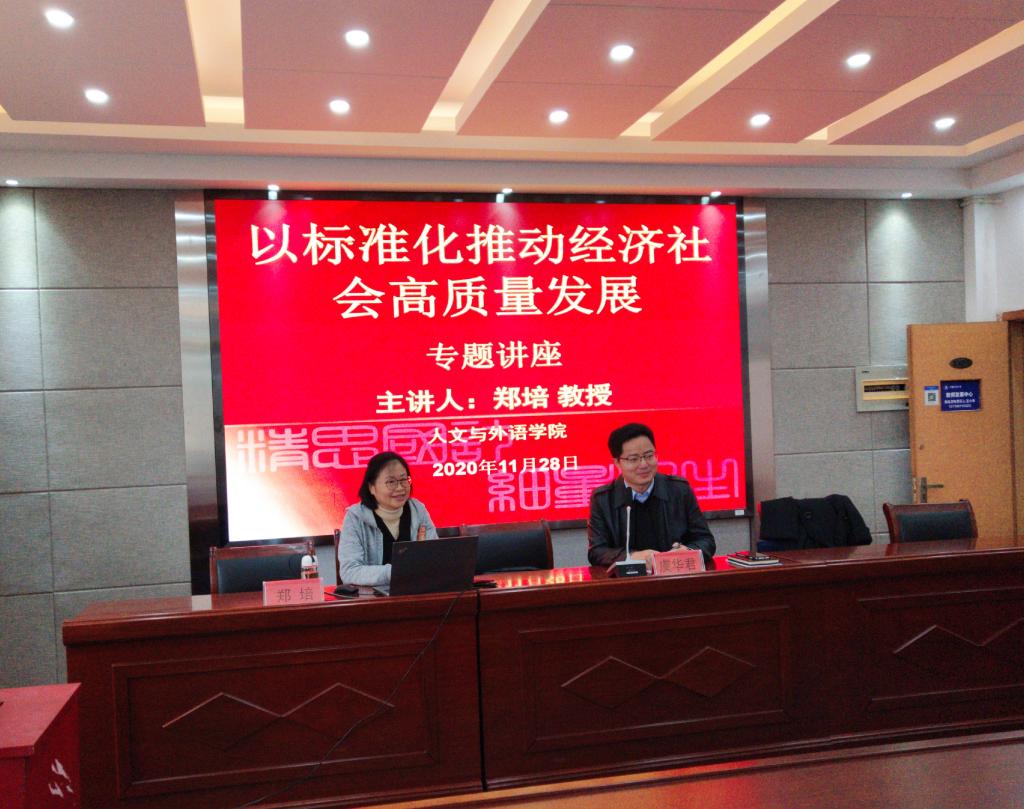 2020年11月28日上午09:30,人文与外语学院在格致中楼307举办了“以标准化推动经济社会高质量发展”主题讲座,邀请了浙江省标准化研究院社会管理标准研究中心主任,兼任浙江省市场监督管理局地方标准技术审查部负责人郑培教授为主讲人。讲座由人文与外语学院副院长虞华君主持,公管本科和公管MPA研究生约70余人参加。