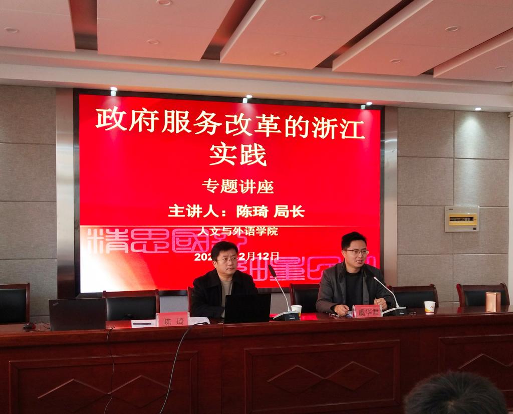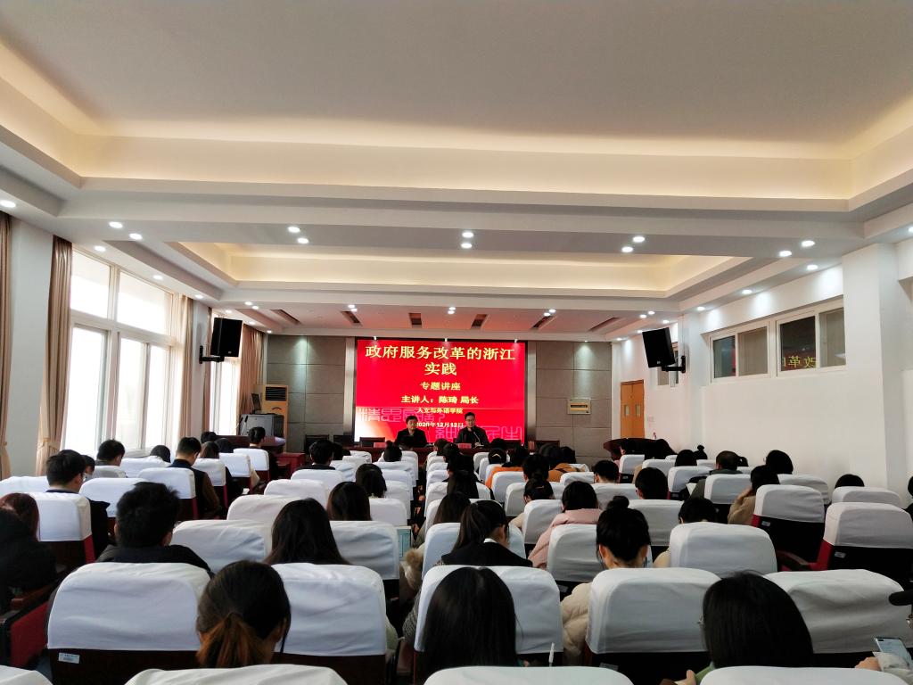 12月12日上午,人文与外语学院在格致中楼307举办了“政务服务改革的浙江实践”主题讲座,邀请了钱塘新区行政审批局局长陈琦作为主讲人,讲座由副院长虞华君主持,相关教师和学生共计60余人参加。
