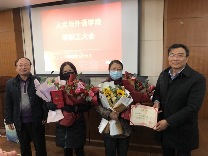 1月11日,人文与外语学院在环宇楼T302举行了高华丽老师和陈红老师的荣休仪式典礼,学院党委书记苏俊杰主持会议,全体教职工参加。