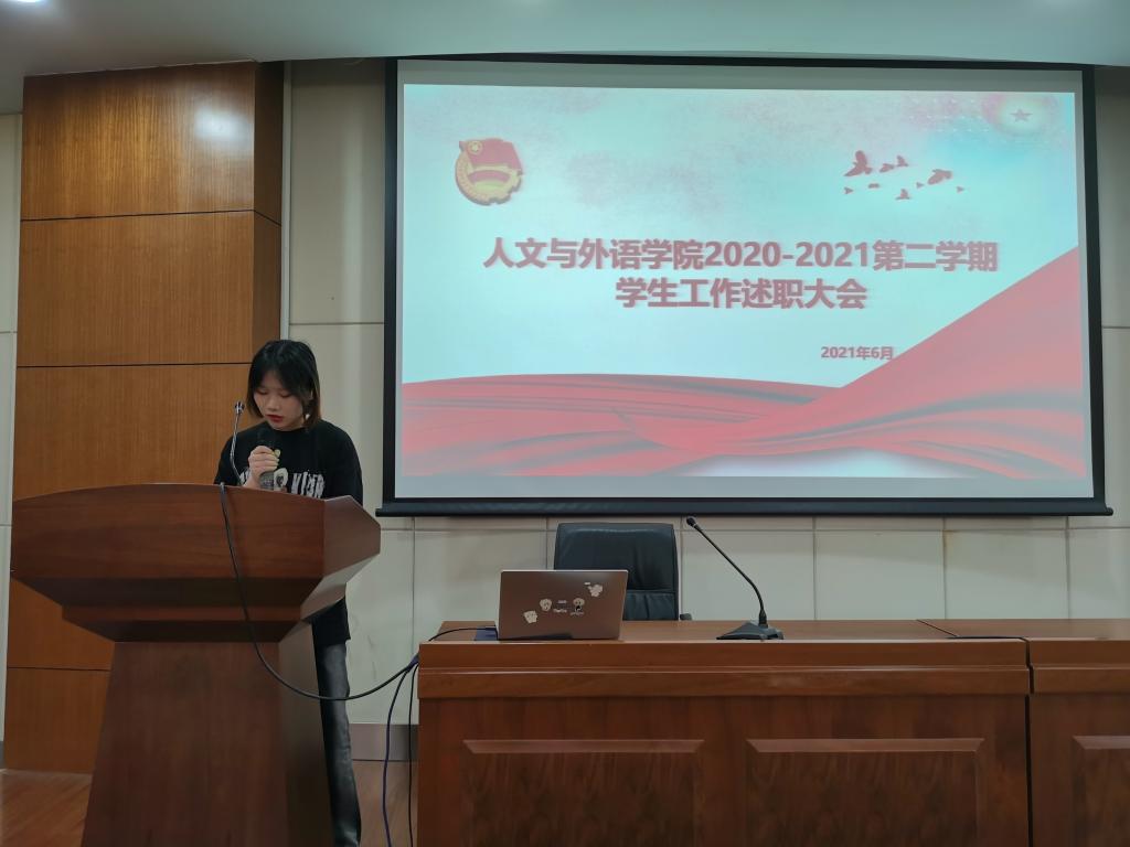 2021年6月16日下午,人文与外语学院在环宇楼T301举行了2020—2021第二学期学生会、研究生会及团学组织述职大会。团委副书记董剡筠老师、学生会和研究生会主席团成员、各团学组织主任团成员出席了本次述职大会。