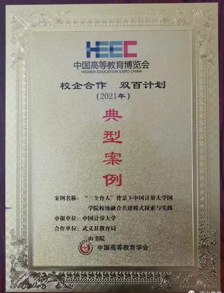 2022年8月4日,在第六届产教融合发展大会上,2021-2022年度中国高等教育博览会“校企合作 双百计划”典型案例公布,并举行颁牌仪式。我校人文与外语学院提交的“‘三全育人’背景下中国计量大学国学院校地融合共建模式探索与实践”案例成功入选,这是我校获得的唯一的文科案例。