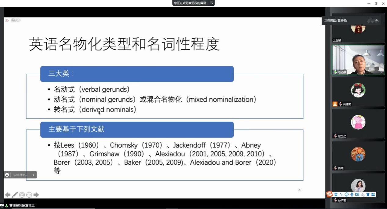 曹教授指出:英语名物化分类复杂,不同类型名物化名词程度不等。根据此前研究显示,各类名物化用法差异和各自句法生成中功能投射差异有关。曹教授从生成语法视角进行阐释。他认为,英语无显性领有格标记的名动式是GerP/nP, 而非DP,其名词性不及外论元有显性领格标记的名动式。最后,有教师基于自身对英语实例及相关概念的理解提出了一些疑惑,曹教授也十分耐心地解答其困惑并交流了相关理解。