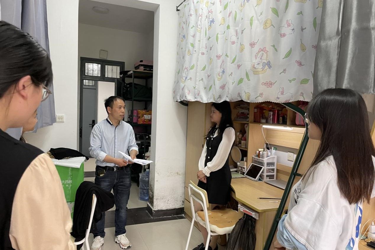 近日,学院党委副书记金民华、研究生辅导员李豪敏走访东校区22级研究生寝室,深入了解同学们的科研和生活情况。李豪敏提醒同学们自觉遵守学校和学院各项寝室安全管理规定,严禁在寝室内存放和使用违禁大功率电器,规范使用电源,做到人走断电,养成良好的生活和卫生习惯,共同营造安全温馨、和谐文明的寝室环境。