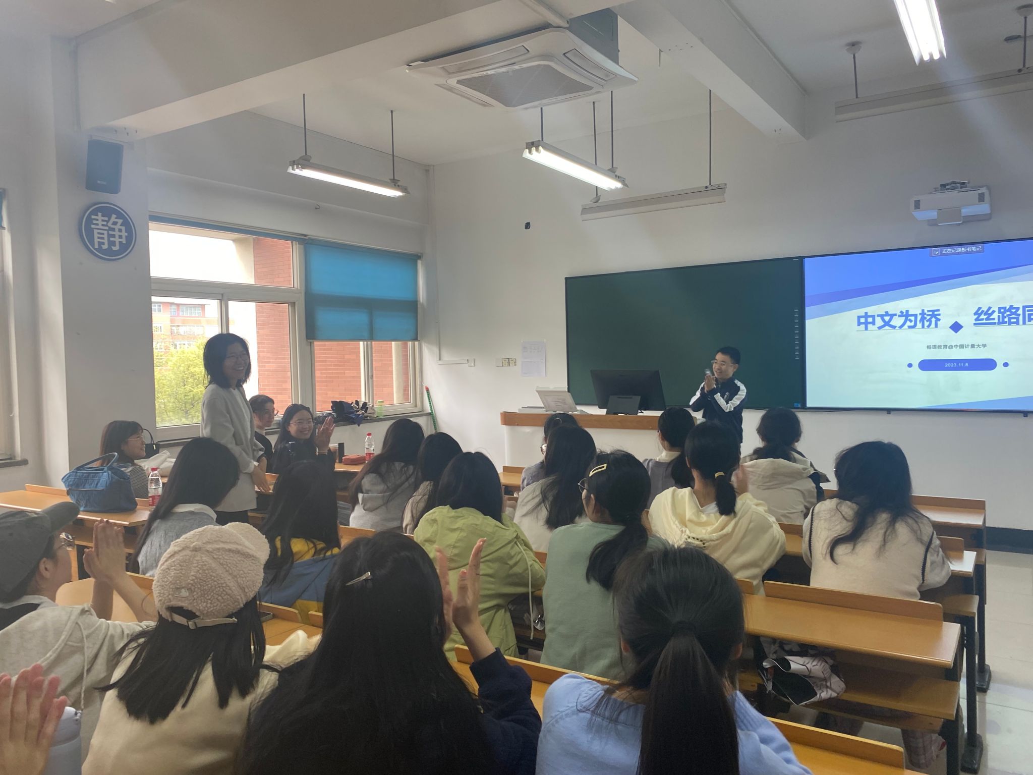 罗小莉结合自身教育经验和畅语教育的创立发展历程等,多方面指出中文传播和国际中文教育拥有广阔的发展前景,提出了“中文为桥,丝路同行”的核心理念,强调了语言传播在文化传播中的重要地位和作用。祝晨聪从自己在坦桑尼亚和越南从事汉语教学的故事入手,改变了同学们的部分刻板印象。她还结合自己担任汉语教学培训师的经历和来自国内外学生的反馈数据,提醒同学们明确职业规划,培养自己扎实的本体知识、外语水平和实践能力,多走出课堂和国际友人进行交流。