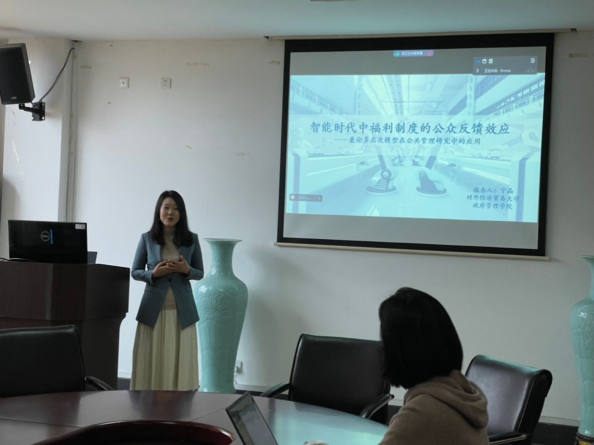 为庆祝人文与外语学院20周年院庆,推进学院学科建设的持续深入,公共事务系于12月12日在格南222举办题为“智能时代中福利制度的公众反馈效应的”学术报告。本次学术报告邀请对外经贸大学政府管理学院副教授宁晶现场报告,公共事务系系主任霍荣棉及系所师生参与了本次报告。
