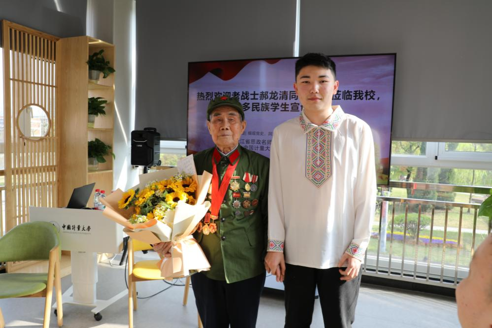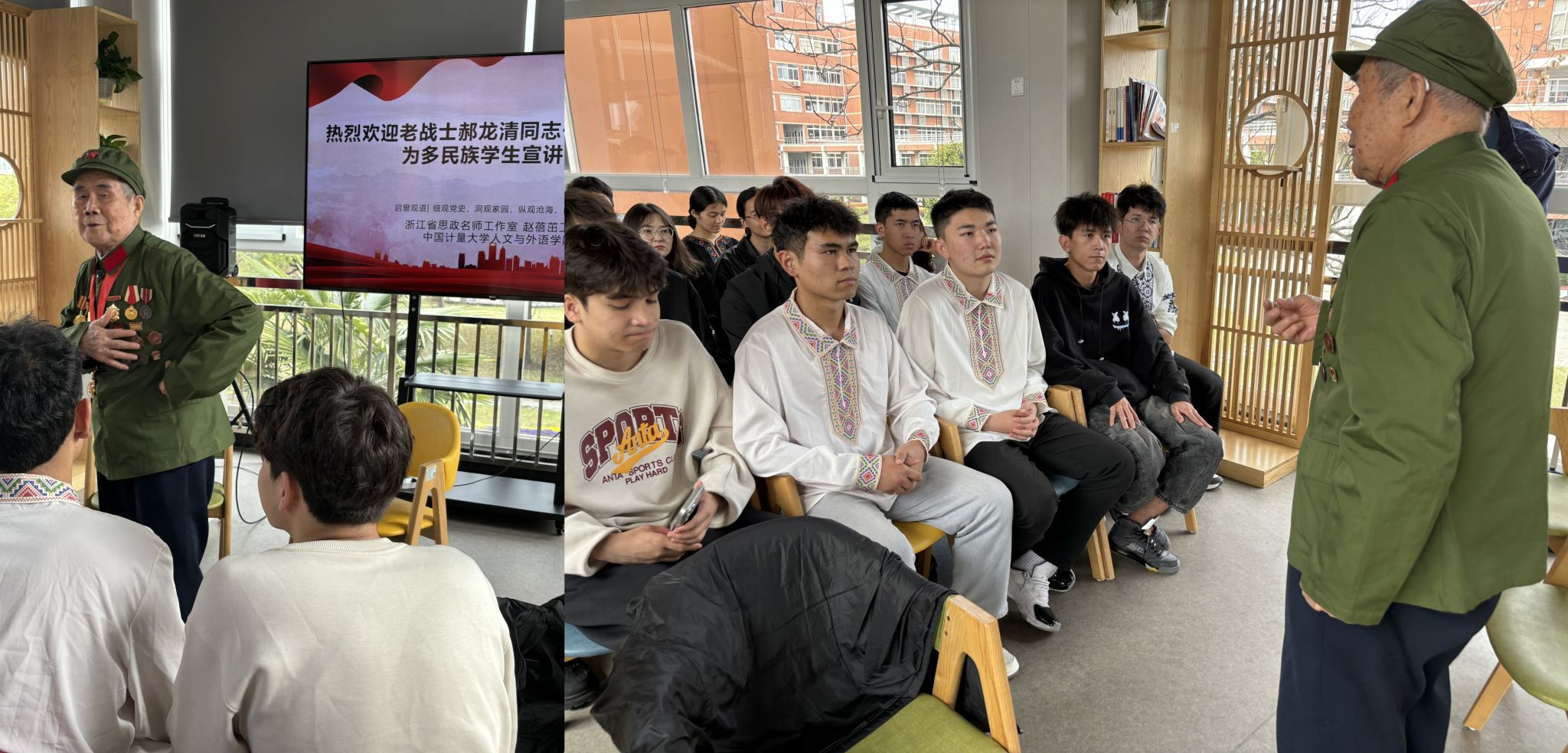 为进一步深化民族团结进步教育,铸牢中华民族共同体意识,加强校地联动、融合共培的民族学生培养模式创新与实践,2024年3月28日下午,由人文与外语学院、钱塘区民族团结进步促进会、浙江省高校思政名师工作室赵蓓茁工作室共同举办了“启窗观道”之在军功章里学党史活动。抗战老兵郝龙清同志,浙江省新四军历史研究分会浙西分会副秘书长刘志勇、人文与外语学院党委书记赵蓓茁、辅导员刘洋和30余名多民族学生参加了此次活动,活动反响热烈。