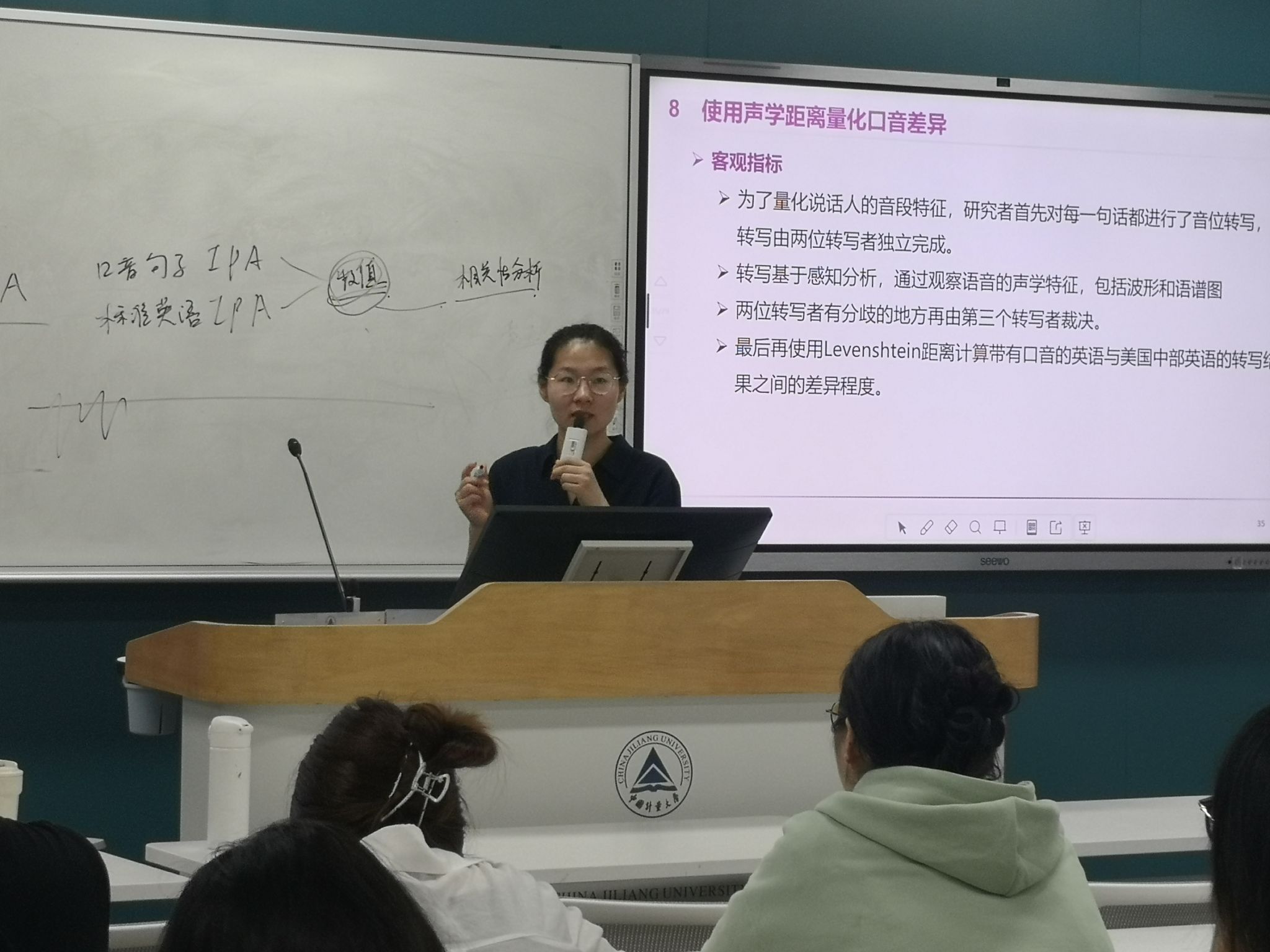 梁煜珠首先向同学们介绍了声学距离量化口音差异的方法及民族地区地方普通话语音声学数据库,为大家构建了一个全面的研究框架。在接下来的分享过程中,梁煜珠结合自身的研究对跨语言词义数据库的研究进行了深入的剖析。在提问环节,梁煜珠与现场的师生进行了互动交流,学生就论文中的研究方法、数据分析提出自己的疑问和见解。梁煜珠耐心解答,并与大家进行了深入的讨论。国际文化传播系的刘美兰、彭飞老师就跨语言词义数据库研究、语音实验研究、少数民族地区的普通话推广研究等话题与梁煜珠展开了对话与探讨。整个讲座与交流轻松愉快,同学们纷纷表示受益匪浅。
