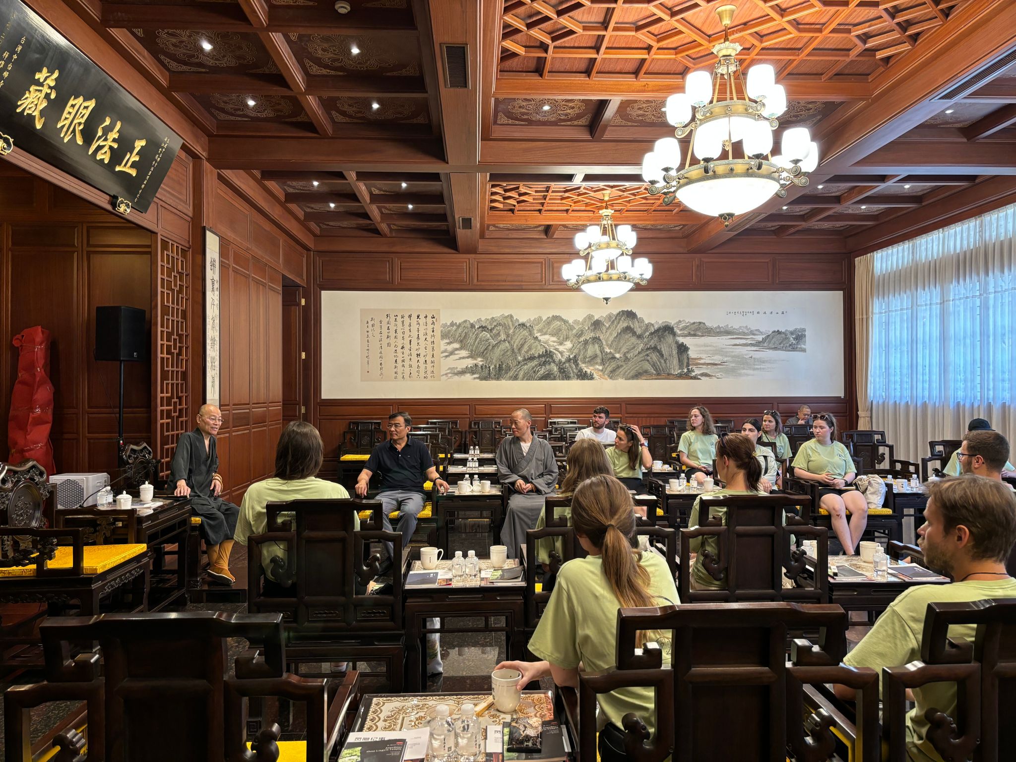 灵隐寺住持光泉法师在客堂会见了邱高兴和夏令营师生团队。光泉法师对远道而来的热爱中国文化的同学表示热烈欢迎,祝愿大家在杭州期间过得愉快。他说,灵隐寺是中国目前最古老最著名的寺庙之一,去年到灵隐寺的游客达到一千两百万人次。飞来峰上的石刻造像最早可上溯到五代时期,已经成为我们珍贵的文化遗产,灵隐寺在杭州、浙江乃至中国,都具有重要的文化意义。大家是中外文化交流互鉴的纽带和桥梁,非常欢迎大家来灵隐寺感受中国传统文化。