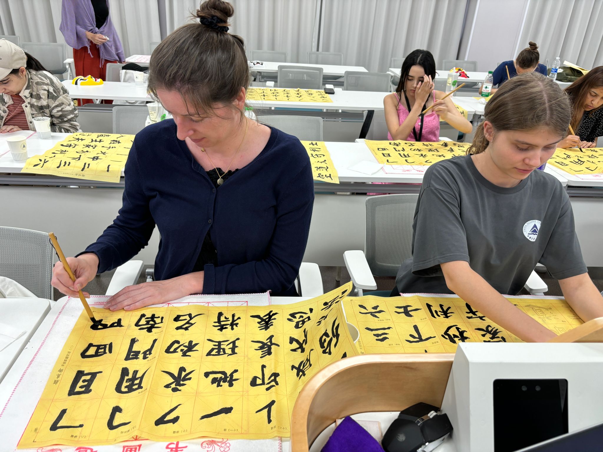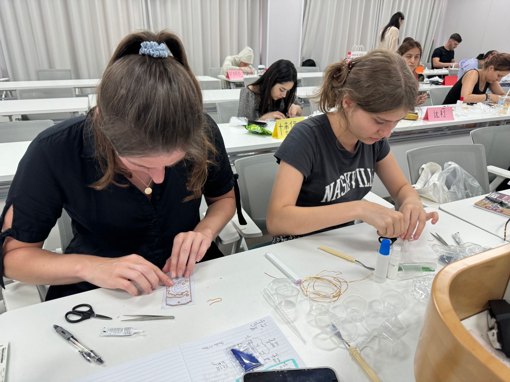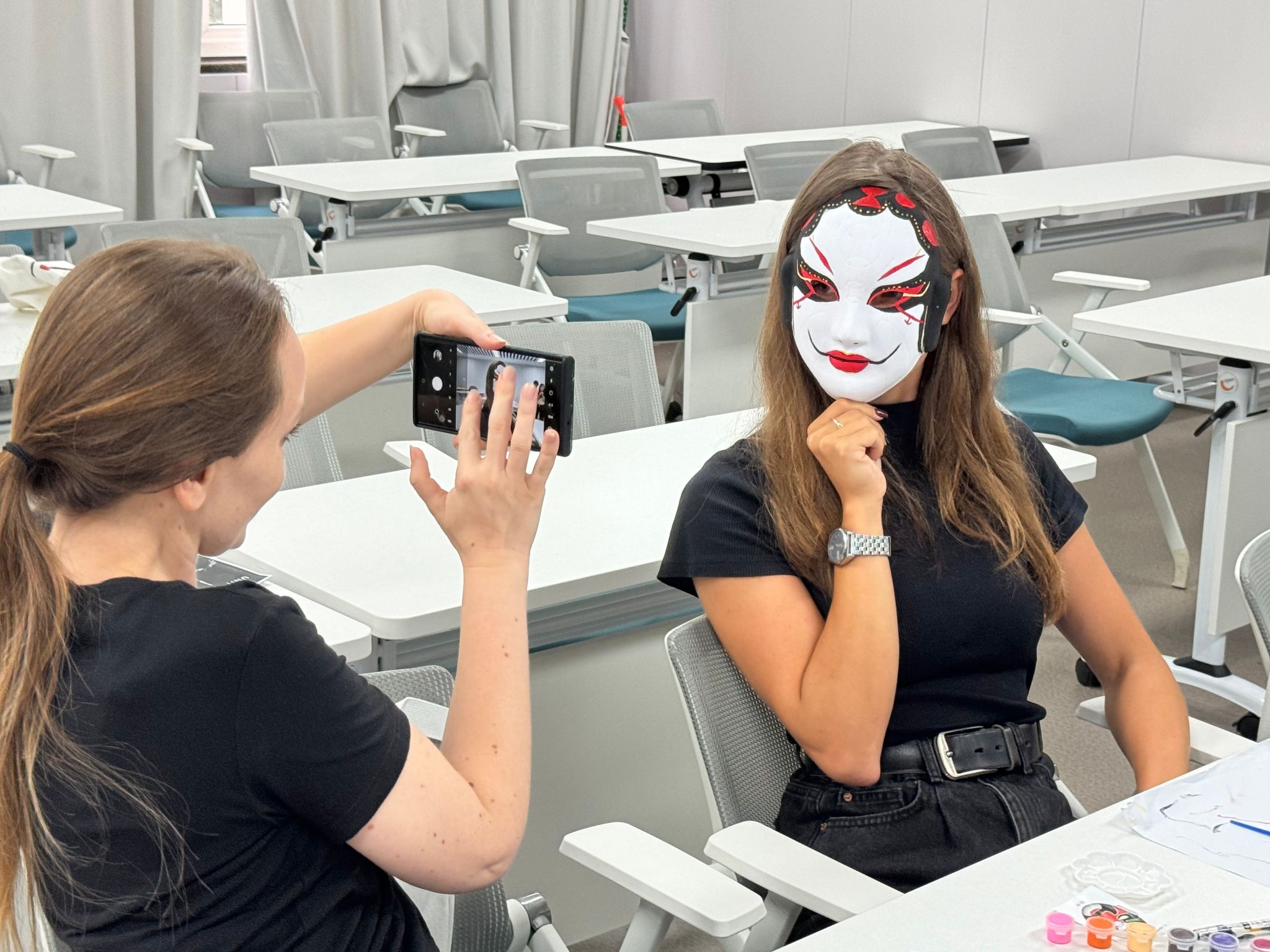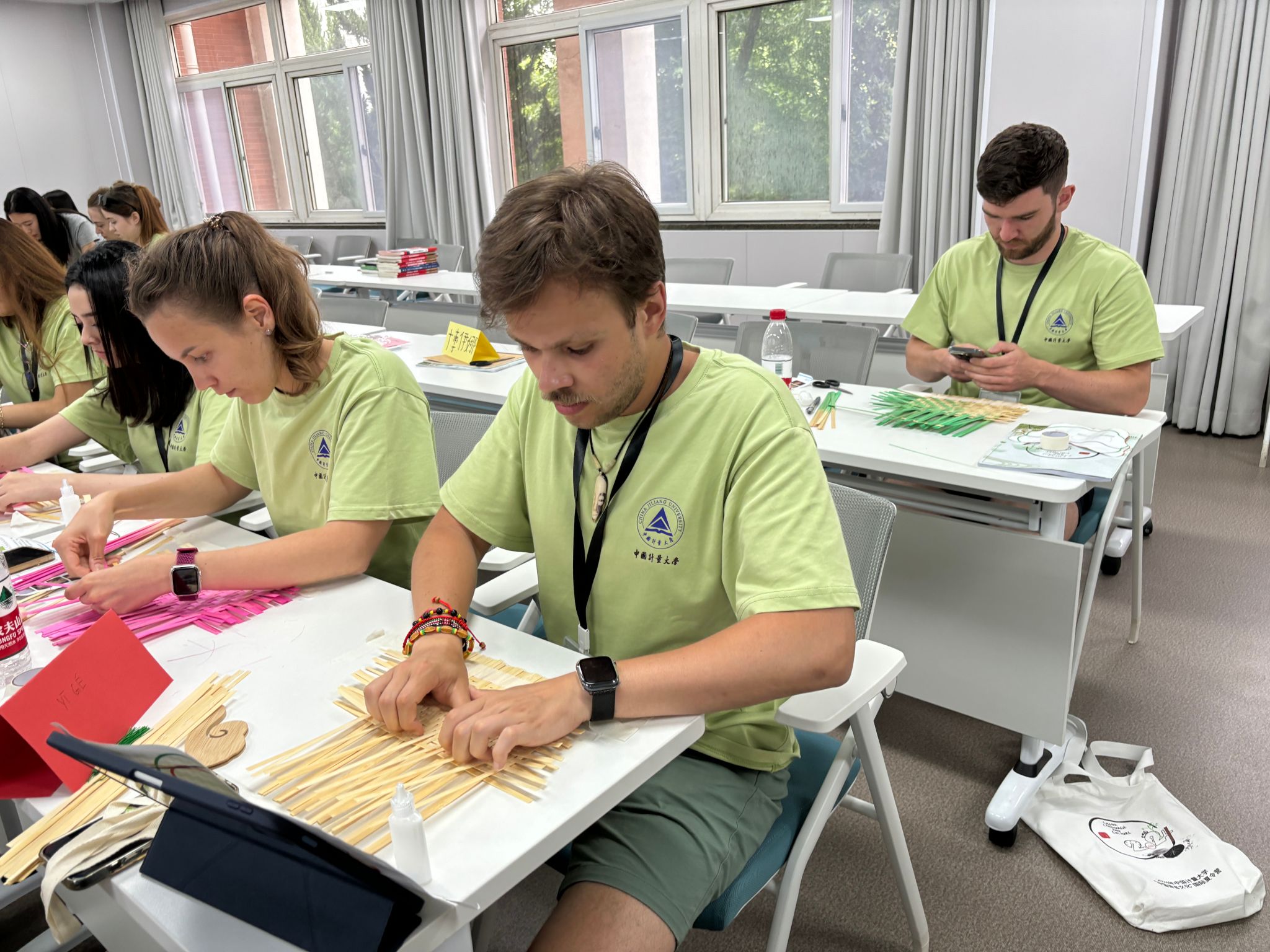上午密集的汉语学习课程之后,主办方在下午时间段开发了一系列有代表性的中国文化实操项目。学员们绘制京剧脸谱感受“东方歌剧”戏剧形式,编织竹扇感受细腻坚韧的中国传统匠人精神,用毛笔书写对联问候本国亲友,操练太极体验八段锦对身心健康的益处,穿戴各制式汉服感受外在形式对内在德行的归正作用。学员们在中国舞的神韵合一和肢体语言中表情达意,在茶艺课堂上体验中国人的待客之道和社交礼仪,在油纸伞DIY绘制中感受中国画的皴染留白艺术,在掐丝珐琅制作过程中体验东西方文化的融合精髓,在手作绒花中感受中国传统日常生活中祥瑞如意的表达方式,在扎染中体验少数民族非物质文化遗产的魅力,在漆扇制作中感受每一把扇面独一无二的纹理神韵,在熏香制作中体验香篆之美和道教文化内涵。