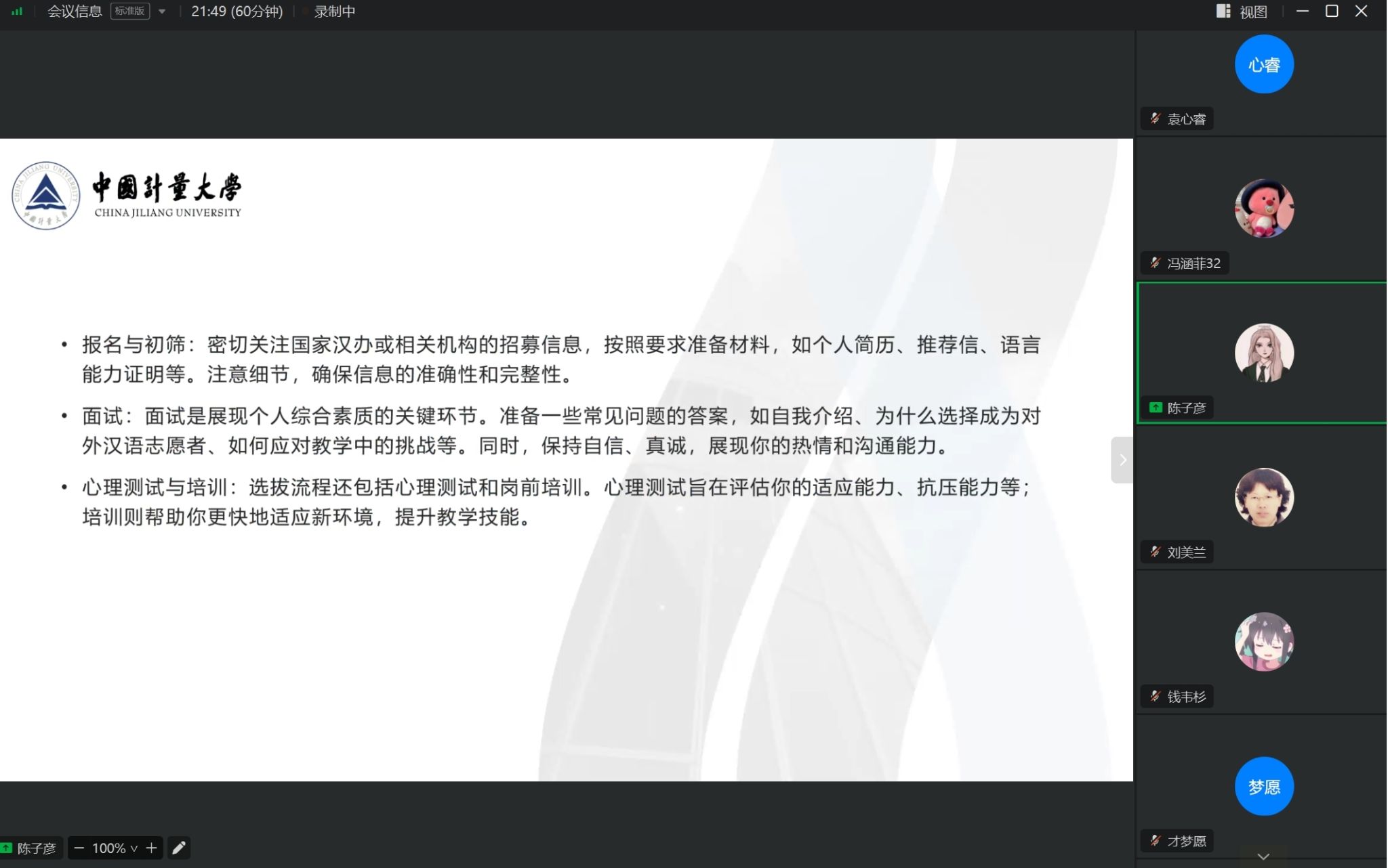 7月27日上午顺利举行了开营仪式,中国计量大学人文与外语学院国际中文教育硕士点专业负责人刘美兰教授首先向学员们介绍了中国计量大学及国际中文教育硕士点的发展情况,包括学院的师资力量、学生情况、学制、研究生入学要求、学院的办学特色、优秀研究项目等。随后,由人文与外语学院梁煜珠老师带来讲座《跨语言语义数据库揭示人类共有的基本经验结构》,梁老师分享了团队最新的研究成果,拓宽了同学们的研究思路。下午,历届优秀研究生为学员们带来了校园生活以及研究生备考的经验分享,为学员们的考研之路提供了宝贵的建议。