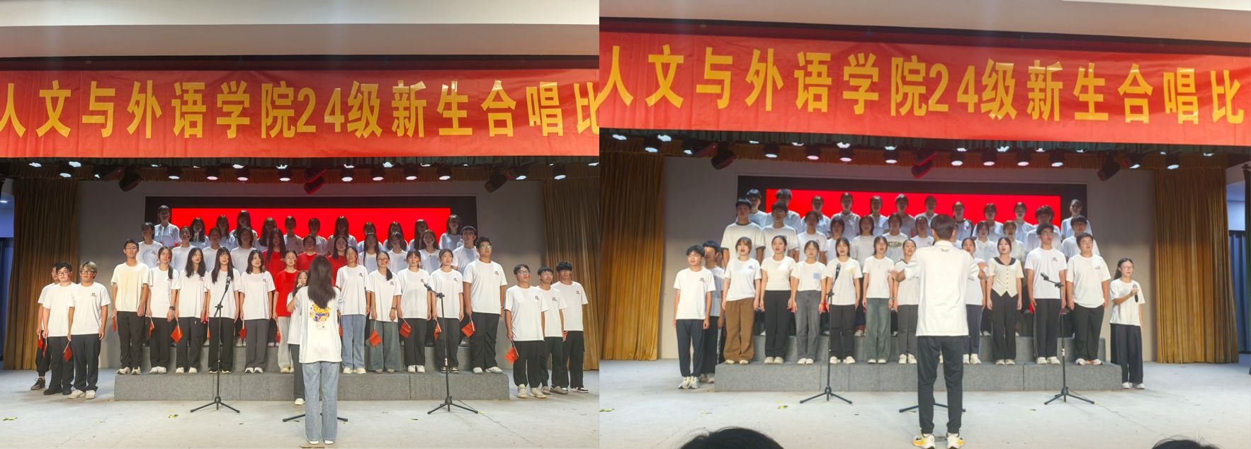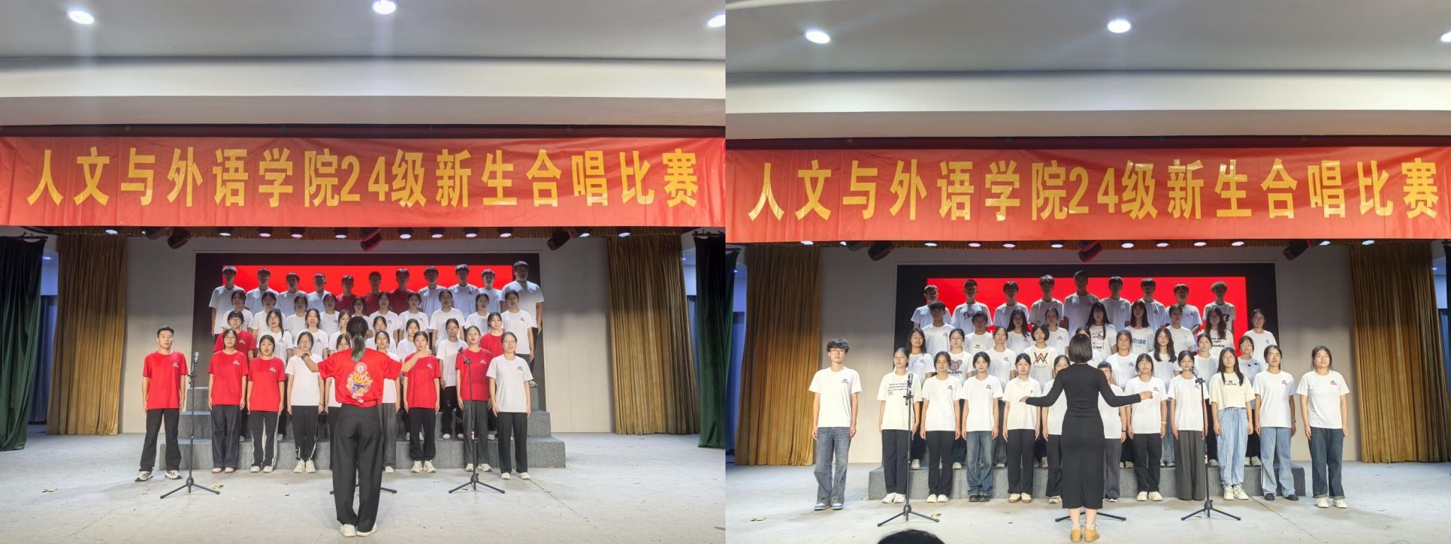 辉煌岁月,时代华章,七十五载春秋如歌。为庆祝中华人民共和国成立75周年,展现人外学子的爱国情怀与时代担当,10月12日晚,人文与外语学院在启明活动中心举办了“七十五载歌盛世,青春合唱献华章”2024级新生合唱比赛。学院团委副书记张璇出席,校均钟合唱团成员章程、林如烟、苏家咏,学院学生会主席陈珂欣、叶潇辰、王候担任比赛评委。