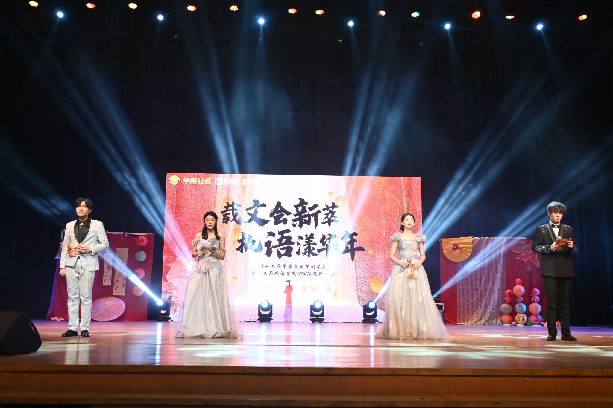 12月8日晚,人文与外语学院第十六届中国文化节闭幕式暨“载文会新萃 执语漾华年”2024级迎新晚会在嘉量大会堂隆重举行。人文与外语学院院长邱高兴、党委书记赵蓓茁、党委副书记金民华、副院长朱锋刚、各兄弟学院团委老师、24级新生班班主任及学院老师代表参加了本次晚会。