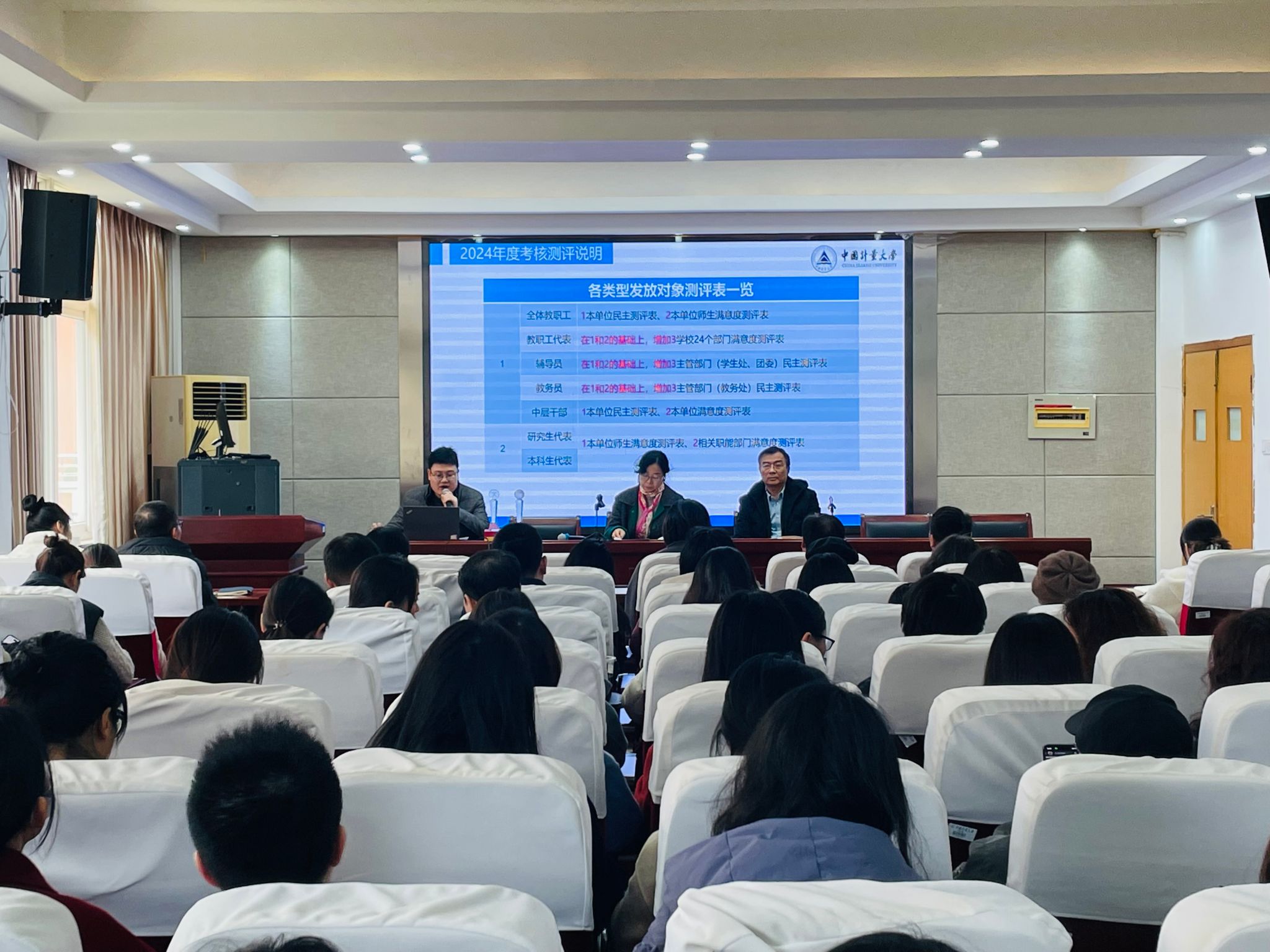 邱高兴院长代表学院领导班子进行2024年度工作总结和工作展望,从诗路文化、宗教中国化、公共文化、计量文化等特色工作,以及教学、科研、研究生、师资、学科、实验室、大学生科技创新、学生培养质量等常规工作方面进行学院工作述职。他指出,学院在2024年取得了一定的成绩,但在学科建设、重点工作指标完成、业绩分考核达成度方面任有欠缺,并就这些方面提出改进措施。同时,邱高兴从个人品德、家庭美德、政治品德遵守,个人在学院工作、教学科研、思想学习方面的履责,以及遵守廉洁守则、落实中央八项规定和党内监督规定等制度文件方面进行述职述廉。
