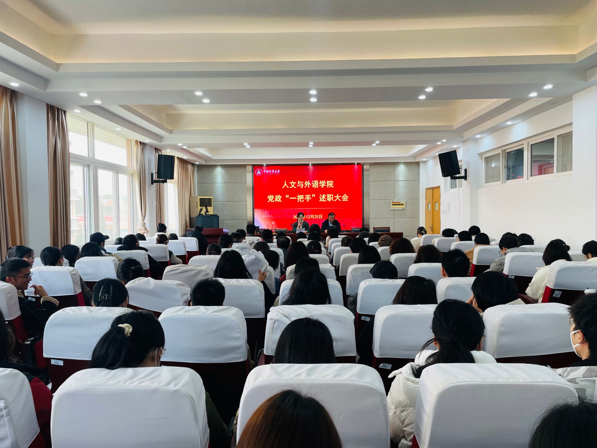 12月25日,人文与外语学院在格中307会议室召开党政“一把手”述职大会,学院党政领导、全体教职工、学生代表参会,组织部吴轴老师到场指导测评工作。会议由学院党委书记赵蓓茁主持。