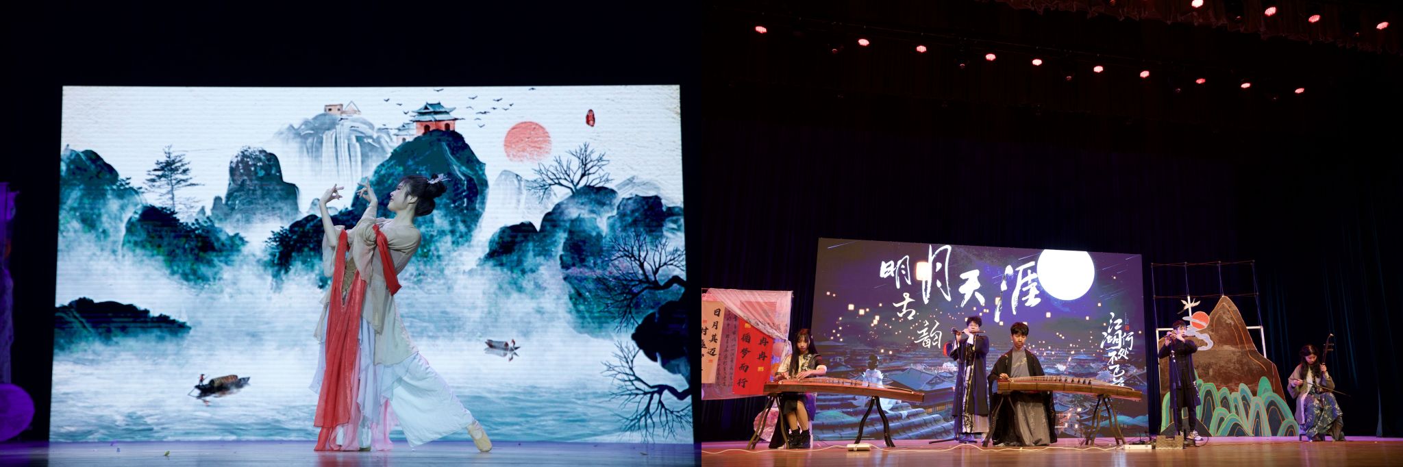 随后,晚会在古韵乐府民乐社所带来的《明月天涯》器乐表演中,拉开帷幕。21外语1班余子羚同学表演的古典舞《万蝶振翅》展现了中华传统舞蹈的古朴典雅、悠扬婉转;2023年浙江省大学生中华经典诵读竞赛获奖团队朗诵的节目《秋瑾》演绎了英雄秋瑾于饥饿贫乏的乱世之中为女性、为国家的呼喊,响彻云霄,向当代青年传递了为中华崛起而努力奋斗的号召;Star.T带来的舞蹈《SHOW YOU GOOD》彰显了大学生朝气蓬勃、激情澎湃的青春风采;SKY音乐社的阿卡贝拉声乐表演曲目《七里香》将如雨水般满溢的爱意,如落叶般堆叠的思念,化作一首首美丽的诗;人外学院艺术实践中心带来的歌舞节目《知否、知否》唱出了时光易逝,舞出了深情眷恋,中华优秀传统文化与现代演绎水乳交融,品古意,思今日,中华文化赓续千年、一脉相承。