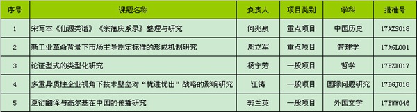 7月5日下午,全国哲学社会科学规划办公室正式发布了2017年国家社科基金年度项目和青年项目立项结果,我校共获得5项,其中2个重点项目,实现了我校在国家社科基金重点项目上的重大突破,将极大提高我校教师申报国家社科基金重点重大项目的积极性,对全面提升我校哲学社会科学科研水平具有重要意义。