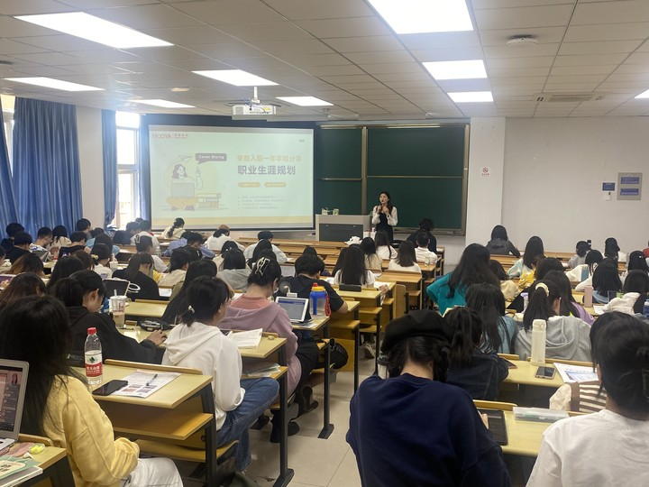 会上,校招经理陈斌煜、校招主管于悦代表豪雅集团进行本次宣讲,从集团发展历史、组织架构、职场氛围、社会责任、成长培养机制及招聘需求等方面详细介绍了豪雅集团情况,并向同学们发出诚挚的邀请。答疑交流环节,同学们就自身专业与岗位匹配度、福利待遇、面试经验和实习经历等问题与两位HR进行了深入沟通。宣讲结束后,同学们纷纷在现场投递简历,表达了进入集团实习或工作的意愿。
