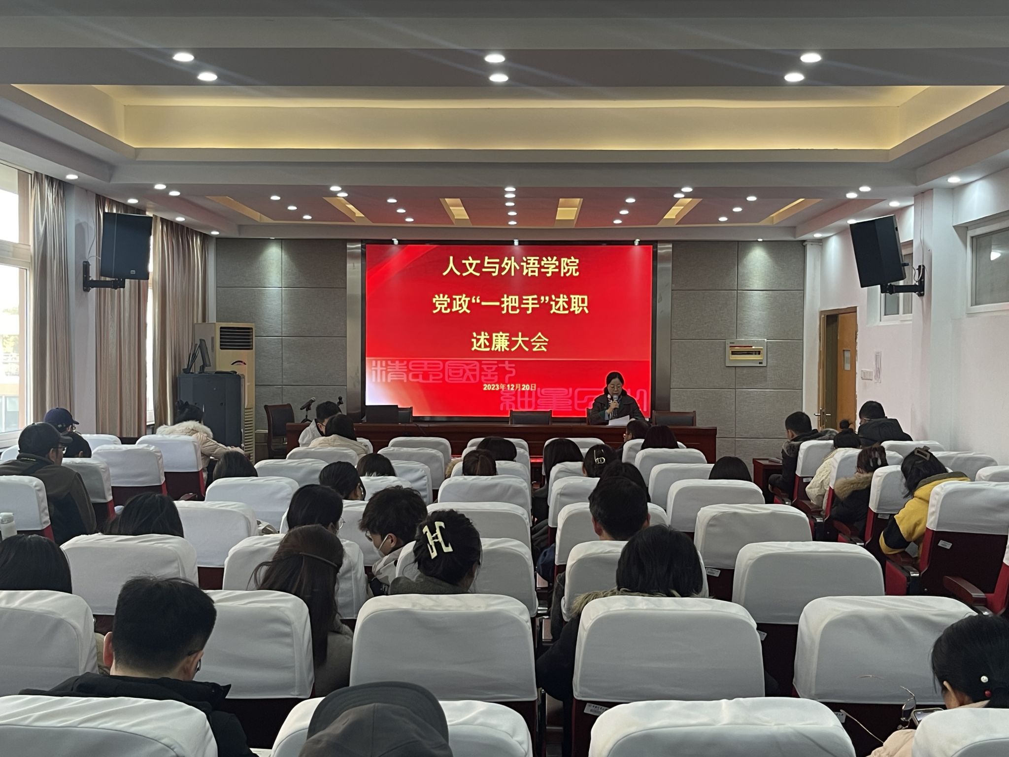 12月20日,人文与外语学院在格致中楼307会议室召开党政“一把手”述职述廉大会。校审计处吴轴老师到会进行民主测评指导,学院领导班子及全体教职工参会,会议由党委书记赵蓓茁主持。