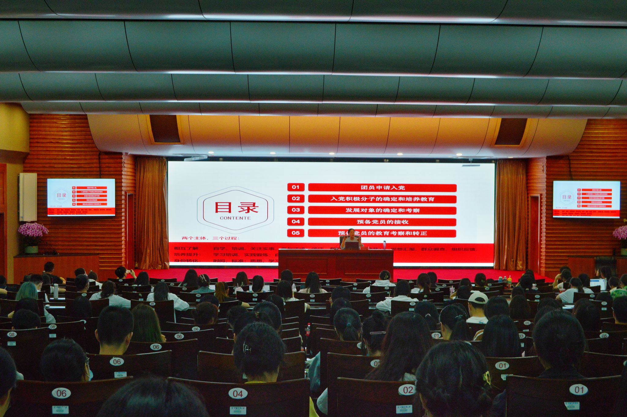 赵蓓茁将发展党员工作流程分环节、分流程进行讲述,就团员申请入党,入党积极分子的确定和培养教育,发展对象的确定和考察,预备党员的接收以及预备党员的教育考察和转正进行了详细介绍。